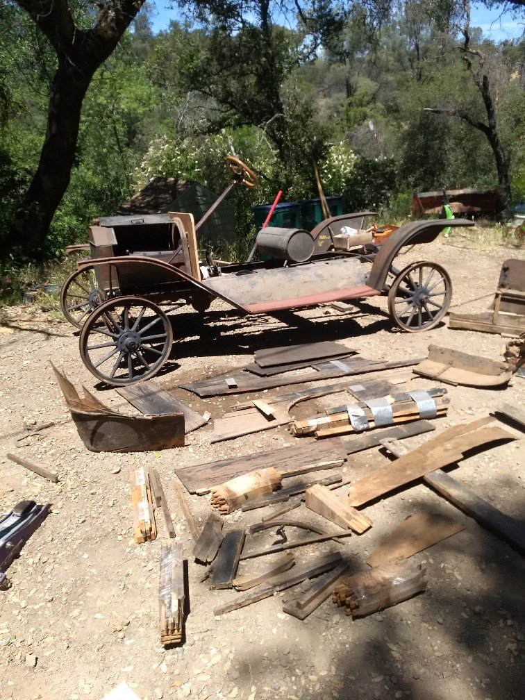 1909 chassis with correct engine block, head, timing cover, hogshead, pan, frame, fenders, running boards, fender brackets, steering column, rear end, springs, radiator, hood, firewall brackets, front axel, many original body parts for touring that was disassembled years ago.
