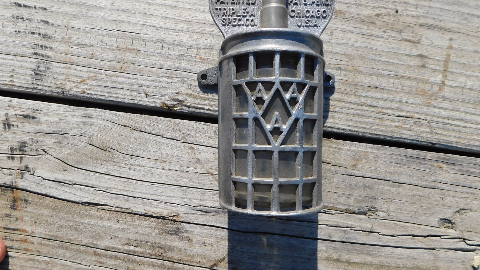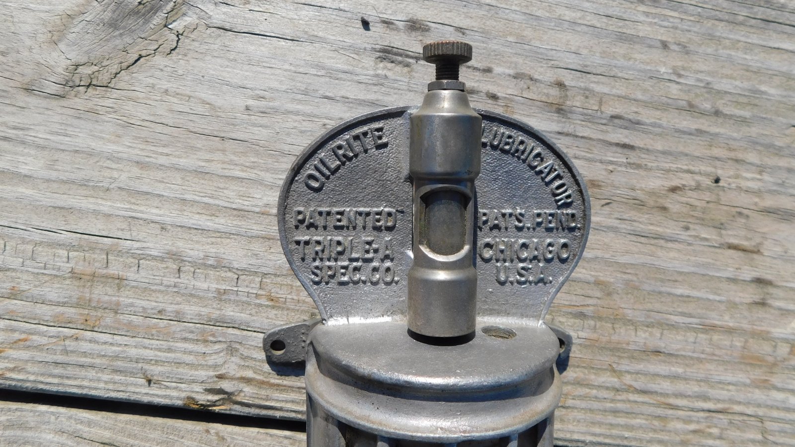 I think it is NOS. Very nice, the writing says oilrite lubricator, patented, pats pend, triple A,spec. co. Chicago, USA. I think it is cast aluminum? Has the original glass jar. $65+ shipping. NO TEXTING five07458677eight.