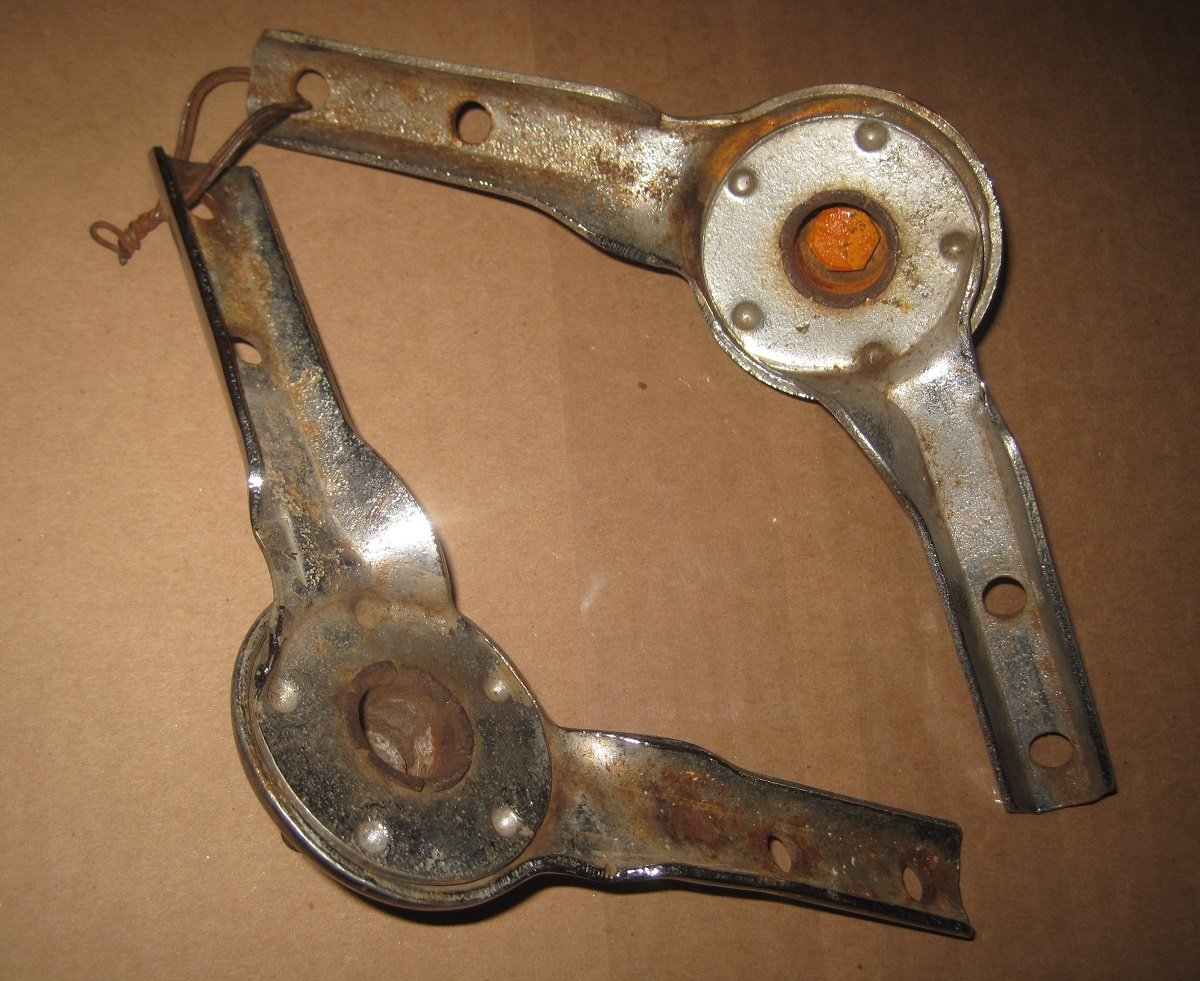 FS: A pair of windshield hinges. They look like your typical 1917-23 hinges except both arms are long. I don't know if these are for a 1914 or maybe even a different make of car. Also, someone chrome plated them at some point which makes them even more of a mess. They're yours for $25 not including shipping.