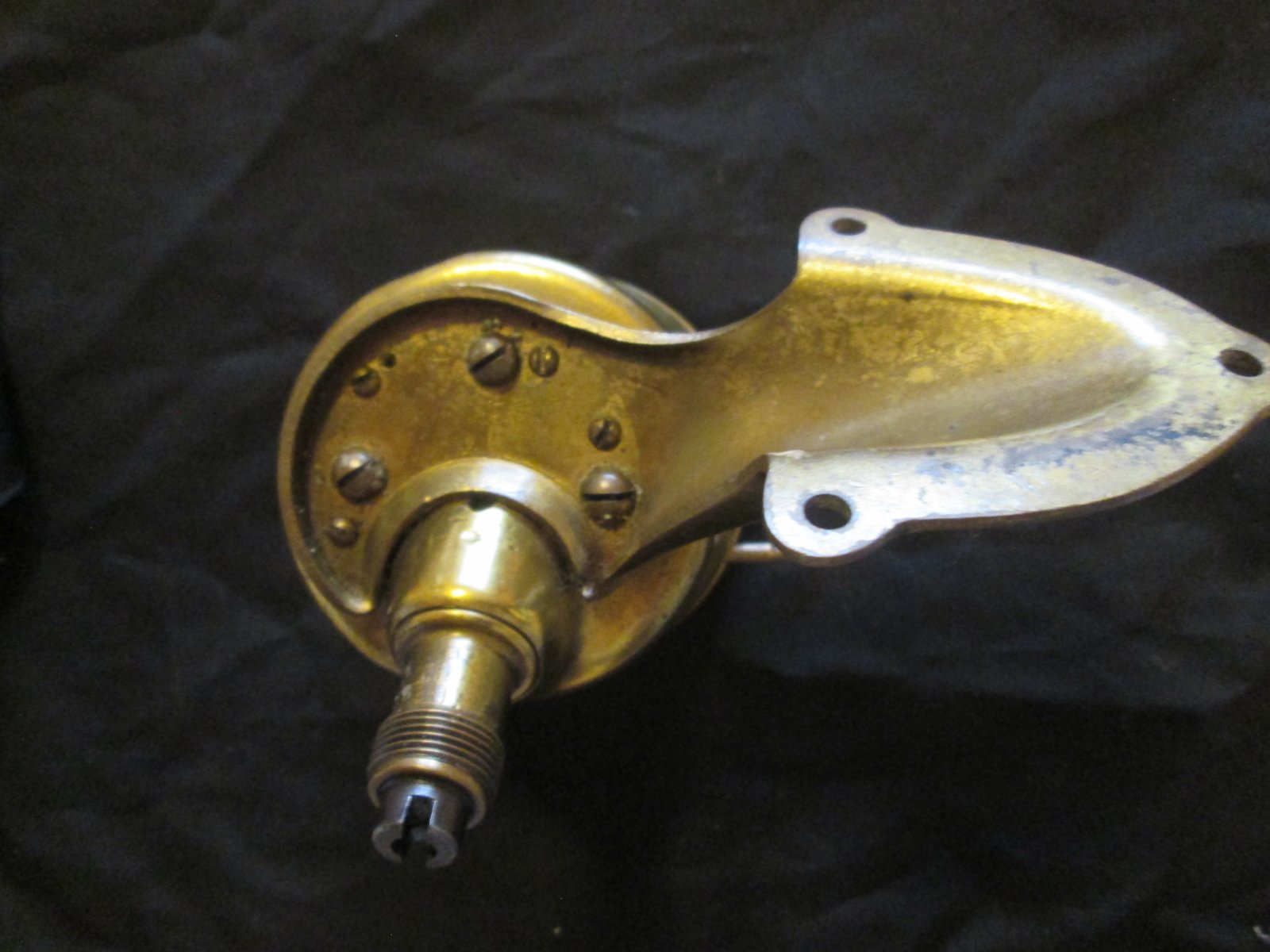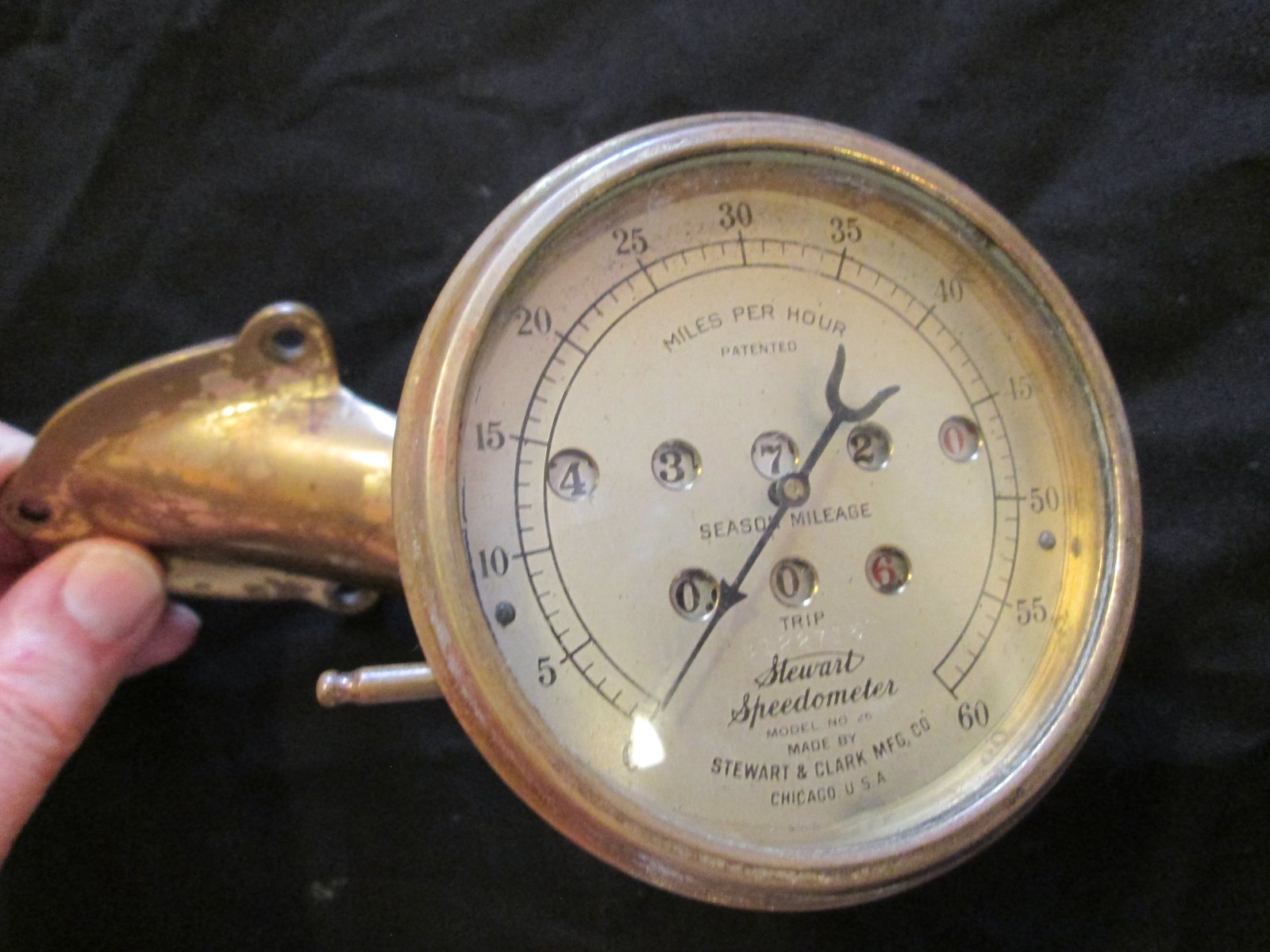 Stewart & Clark model 26 speedometer with a 3 inch face and mounting bracket. It seems to work as lightly spinning the drive end moves the needle. This speedometer is housed in a brass case. $300.00 plus shipping.