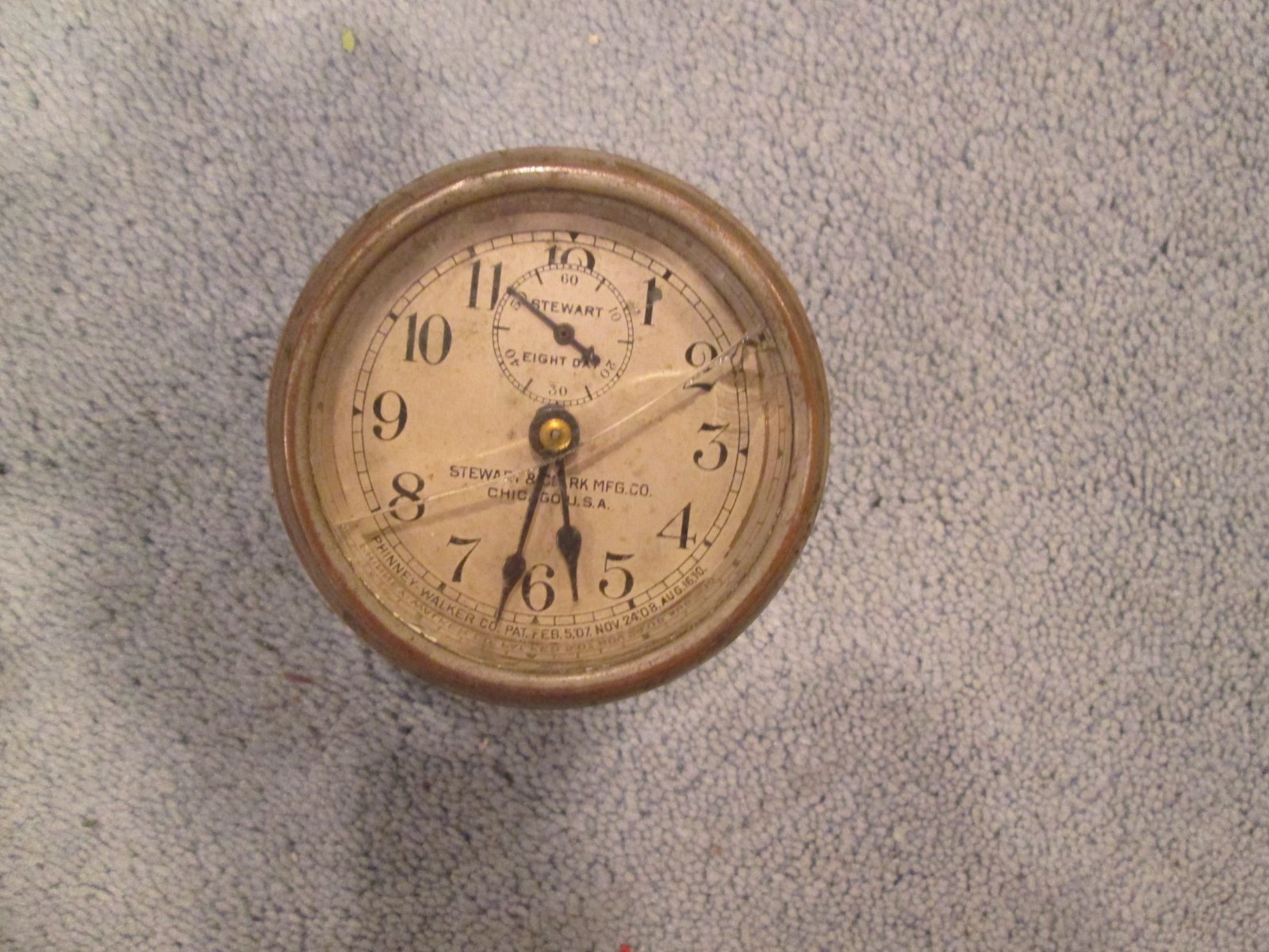 For Sale is this Stewart and Clark rim wind clock with a 3 inch face. The Lense is cracked but the face looks to be in good condition. It is wound tight and does not work. Asking $250.00