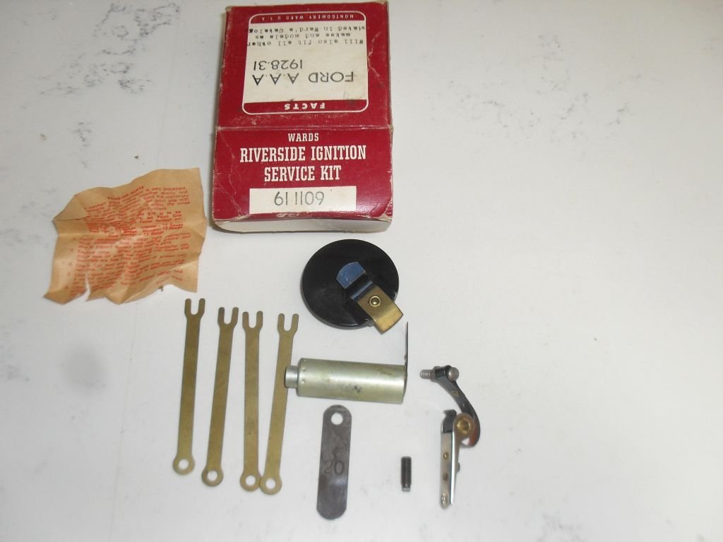 Model A and AA ignition service kit from Montgomery Ward. Part # 61 1109 This sale Has two (20)sets of Points Oe (1) set of plug connectors, and three (3) rotors, and two (2) sets of points. $65.00 for all the tune up parts plus the costs of postage. I will break into two seperate units if necessary.