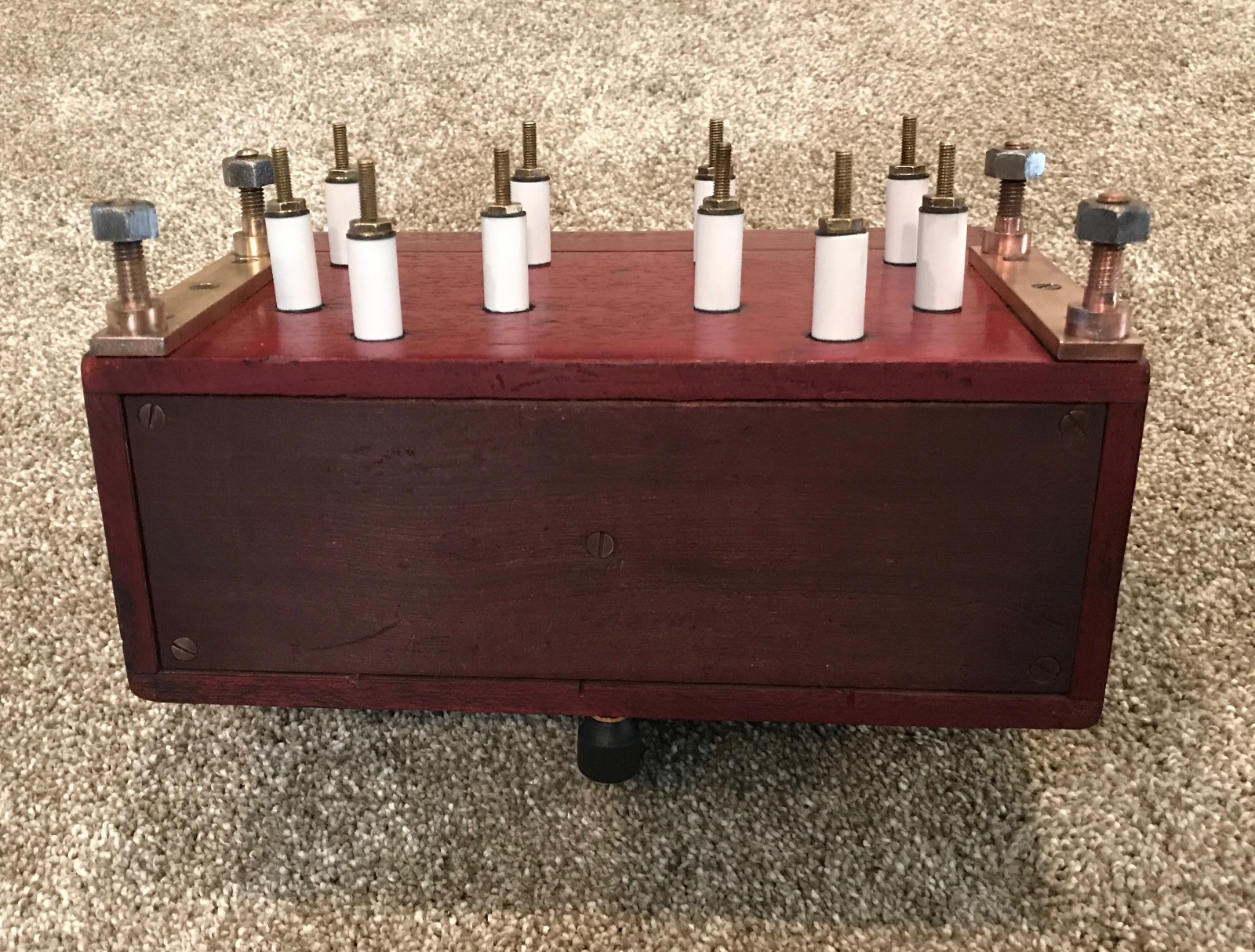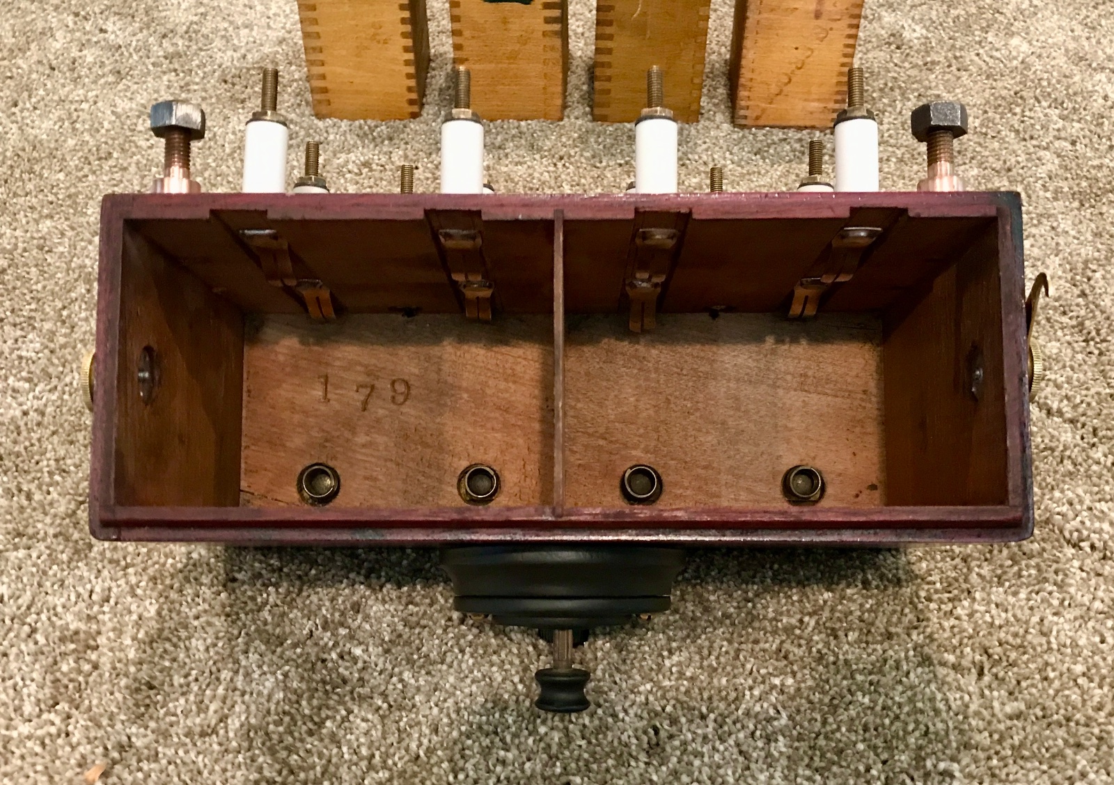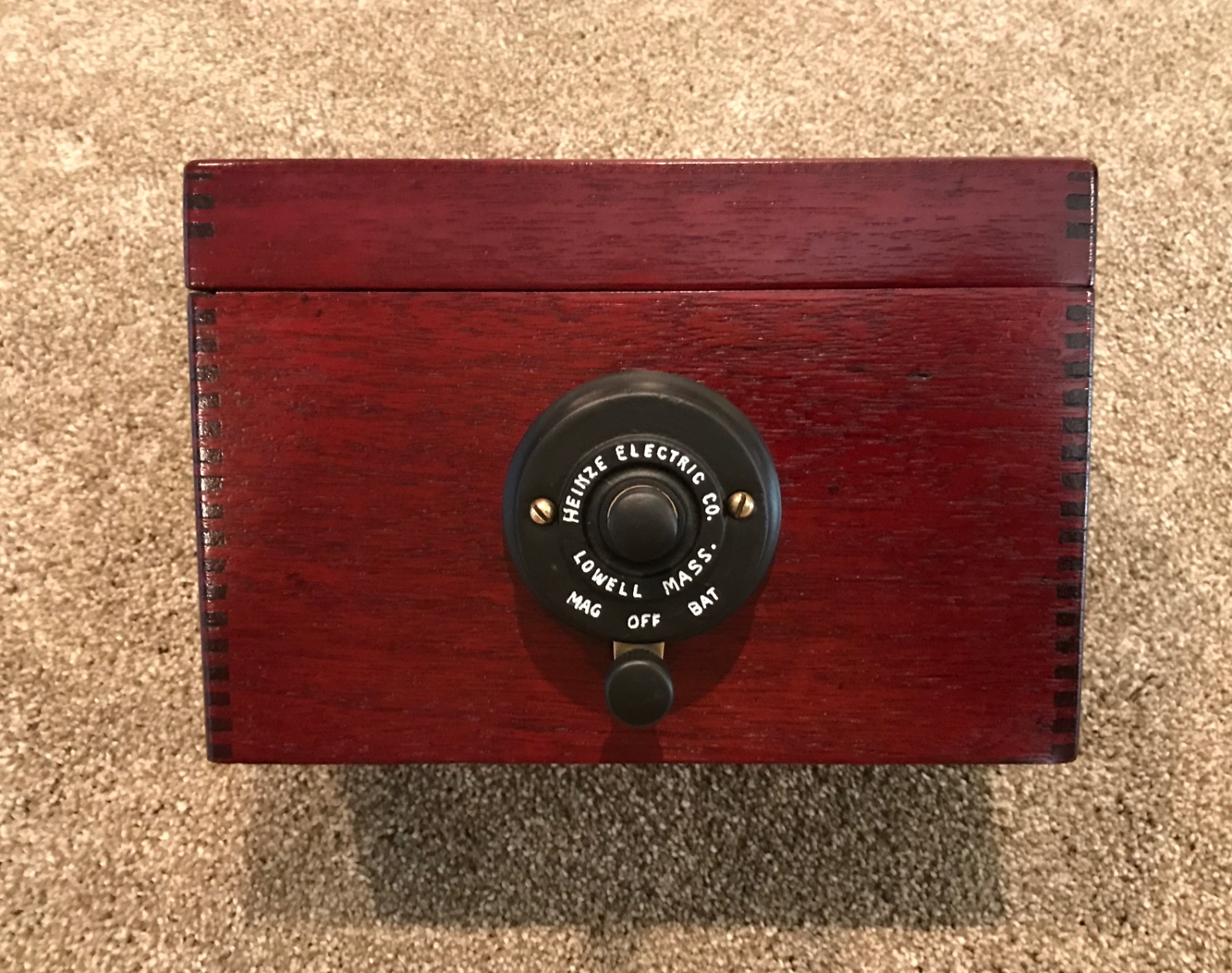 1911-1913 ORIGINAL Slant-top Heinze 4600 coilbox and a set of 4 Heinze coils. The original numbered, matching lid wood box is in beautiful condition, with a nice stain and finish. It has the original mounting brackets and nuts, and original offset thumbscrew lid latches. The original Heinze switch is in nice condition and includes the key, working as designed. The correct offset contact Heinze coils are untested, 3 are very solid and may work as is, a fourth requires rebuilding. Very hard to find a complete set of coils with such a beautiful original box. Includes an unused reproduction lid label. 750.00 includes shipping.