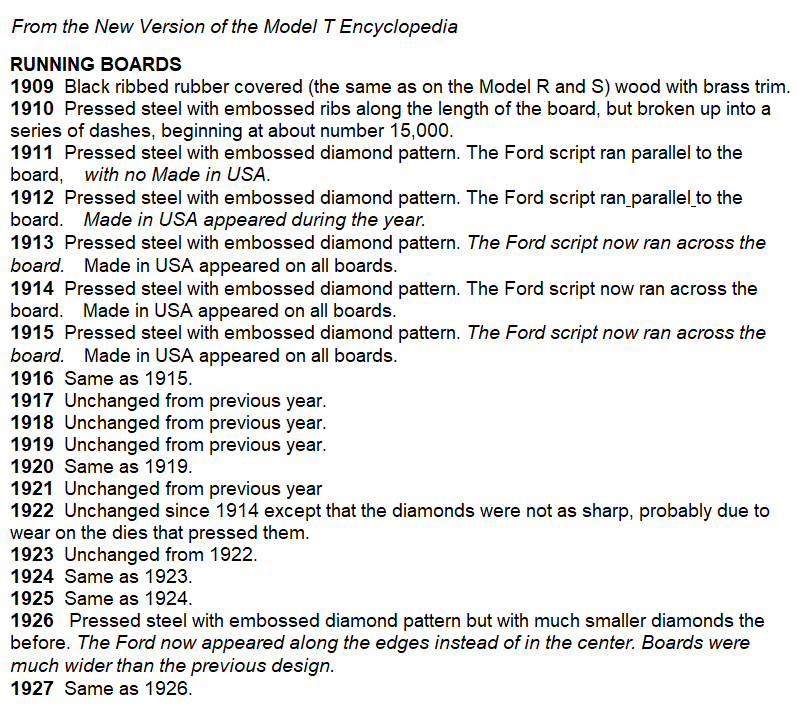 The 1913 running boards had the Ford script stamped across the boards, so then there was no left or right. Previously, to keep the Ford script facing the onlooker, the different spacings for the front and rear running board mountings meant there was a left and right, according to the running board bracket holes.