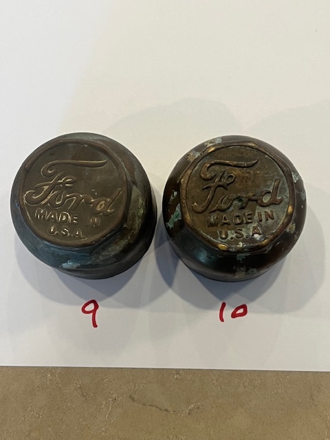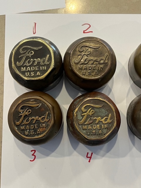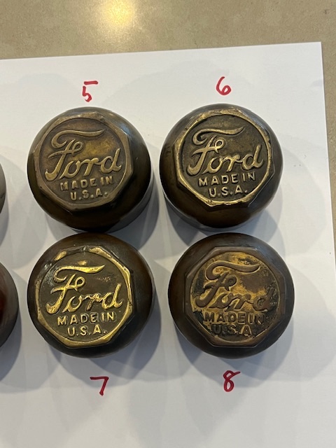 Brass hubcaps, 1914-16. Take your pick, no cracks, all are in good to better condition. $20 each plus shipping. Kdmks AT att.net.