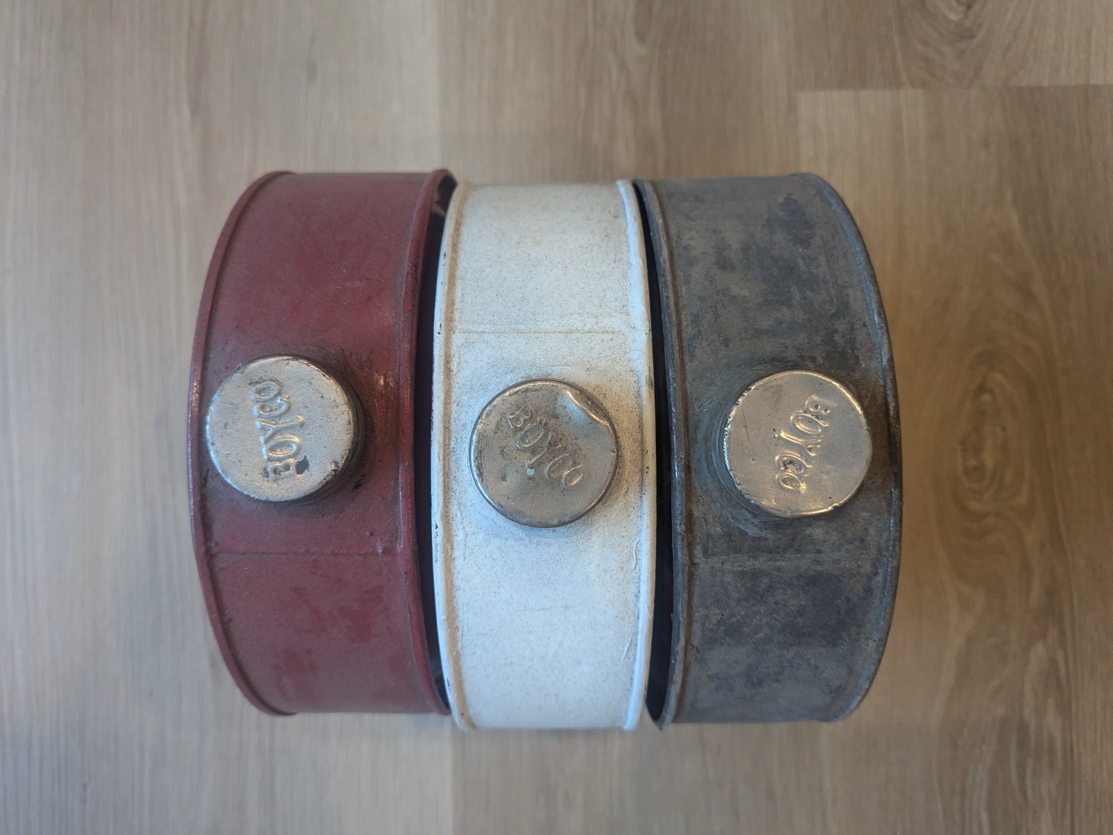 Set of three Boyco running board cans (9-3/8" deep). These are in decent shape, but do note the dent in the unpainted can. $200 OBO plus shipping. Local pickup in Burbank, CA