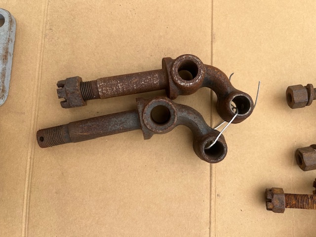 Stewart speedo, 1909-10 tie rod end, valve cover, body brackets, rear muffler half, 11-4 tail pipe, manifold clamps, tail light bracket, hood hooks, front perches and speedo gear are all sold.