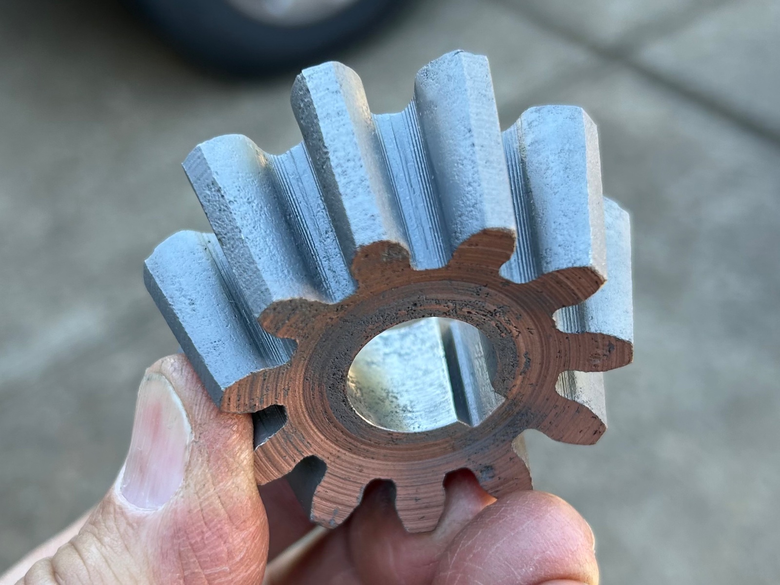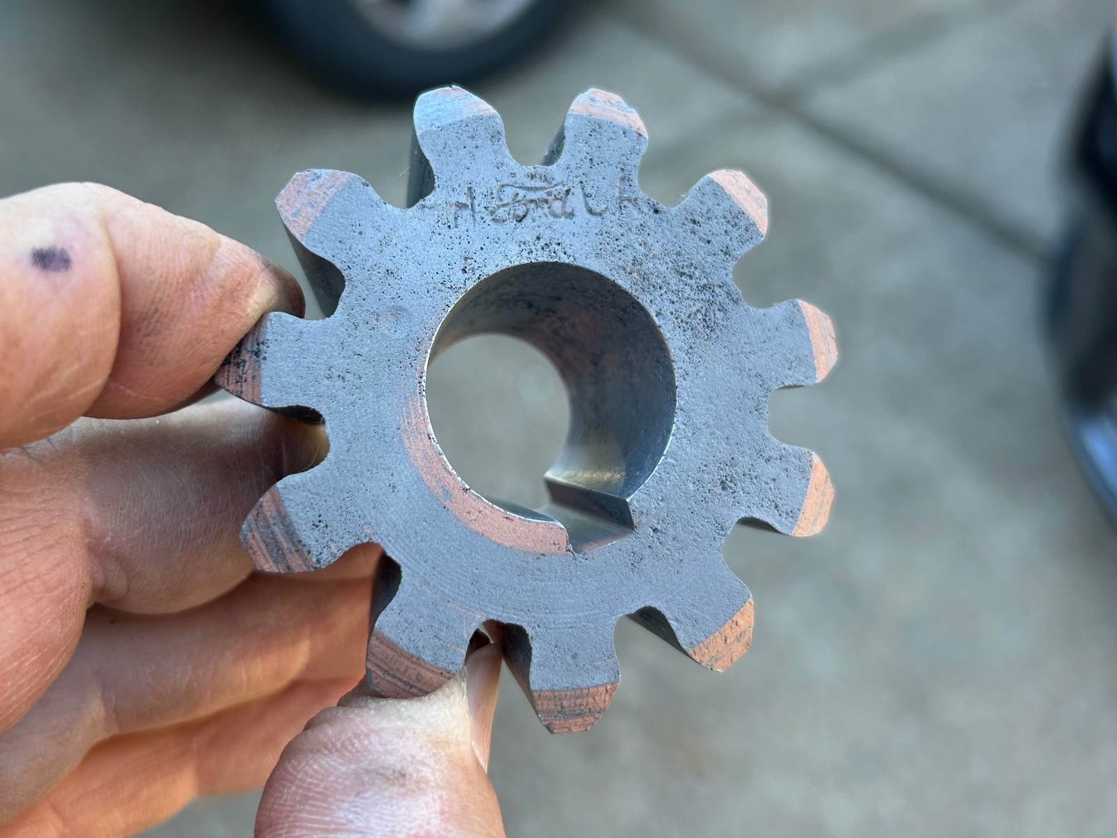 Ford pinion gear fresh out of the bead blaster. Keyway looks good. The bore has some minor pitting as does a few of the teeth. I have tried to show the worst of the pitting on the teeth. Teeth profile look good and there are no chipped teeth.
