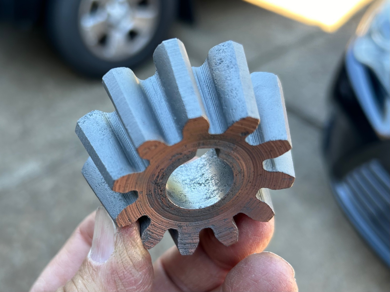 Ford pinion gear fresh out of the bead blaster. Keyway looks good. The bore has some minor pitting as does a few of the teeth. I have tried to show the worst of the pitting on the teeth. Teeth profile look good and there are no chipped teeth.