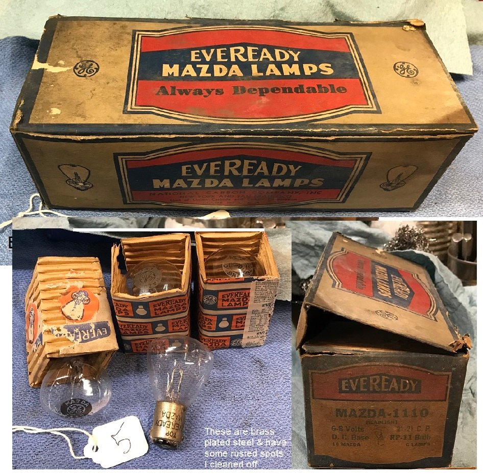 All the bulbs are NOS & have dual tee-pee shaped filaments at equal heights as original. They are 6-8 volts and 21-21 c.p. & fit a headlight base socket. Boxes 1, 2 and 3 each have 10 bulbs with silver color base. Box 4 has 10 bulbs with brass color base over steel. Box 5 just 3 or 4 brass / steel base bulbs and box). I tested all the bulbs for proper continuity so they can be used. The c.p. isn't really bright enough for night time driving but could be good for a brake/tail light with appropriate socket & wiring. They make a nice display item.