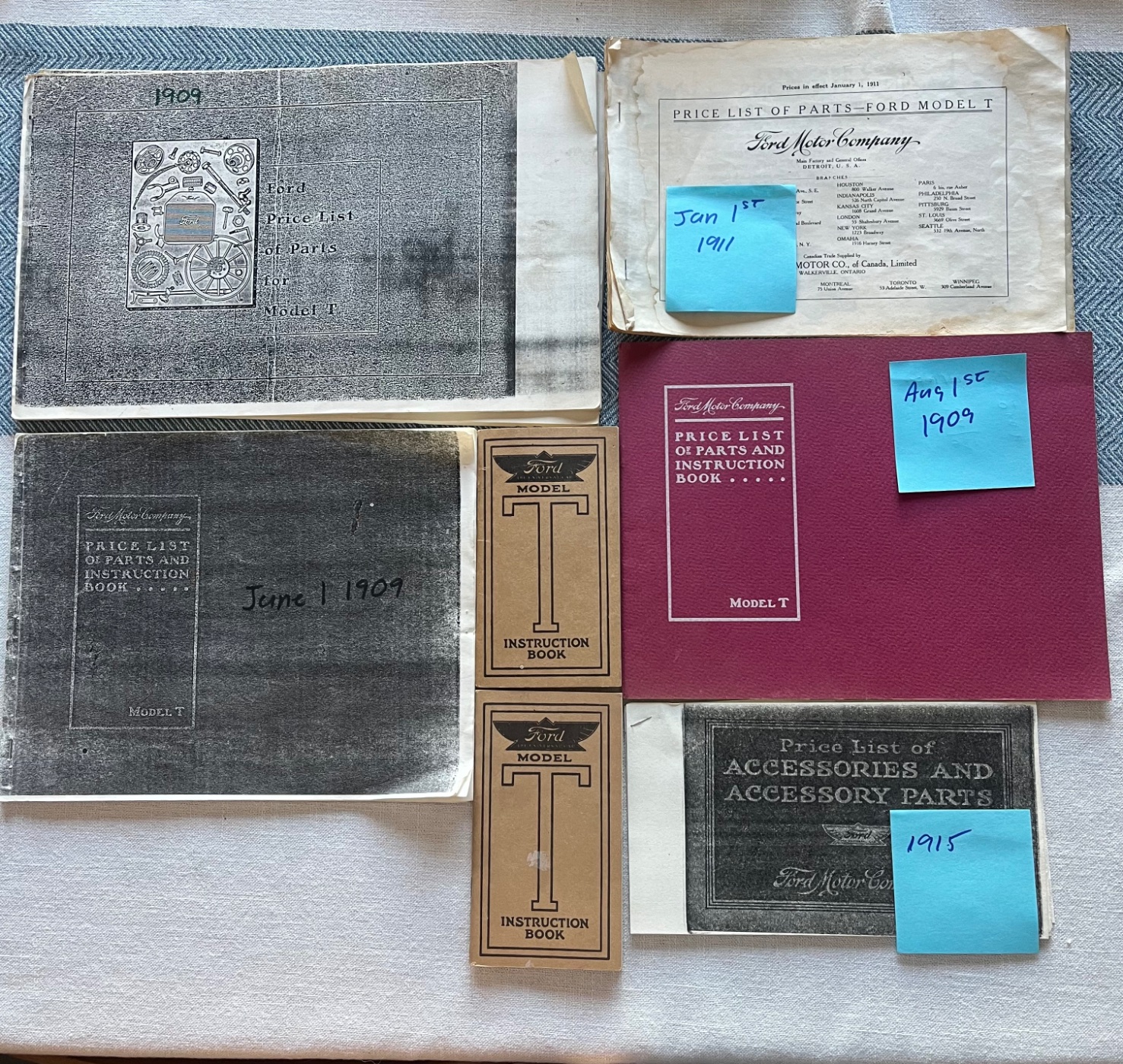 1908 parts book is still available, 1915 accessories and accessory parts, and pocket instruction book are still available.