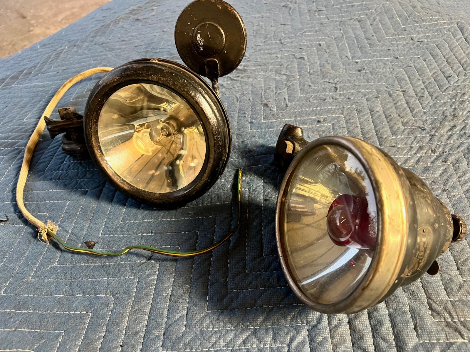 For sale are two working spotlights that can bolt onto Model T windshields, one is an Old Sol Model with a sideview mirror attached and one is a TW Wakefield model spotlight. Both have firm clamps and both have perfect lenses and have bulbs included. Original finish and paint. Asking $125 for both plus shipping. Text Jim 630-608-3978