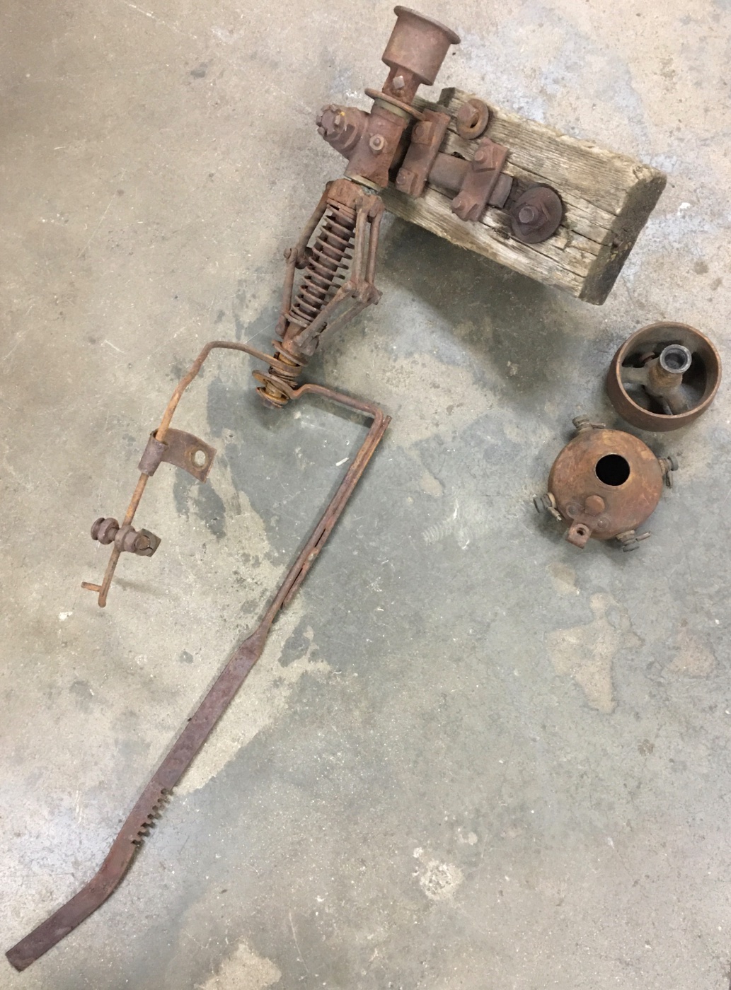 This is an ingenious item. It looks partially manufactured and partially home made. It is a great “wall hanger” just as it is. It would require complete restoration to use (disassemble, clean, lubricate, and adjust to use). It was on an air compressor outfit that used 2 T motors connected front to rear. The front motor was power and the rear motor was the compressor and it was so brilliantly made it had to be constructed from some plans that were available back in the day. Note: This is an item for those of appropriate skill level. If you don’t understand exactly how it works, how it mounts, and how it connects to the carb just by looking at the photo, you should not expect that you will be able to restore, install, and use it…