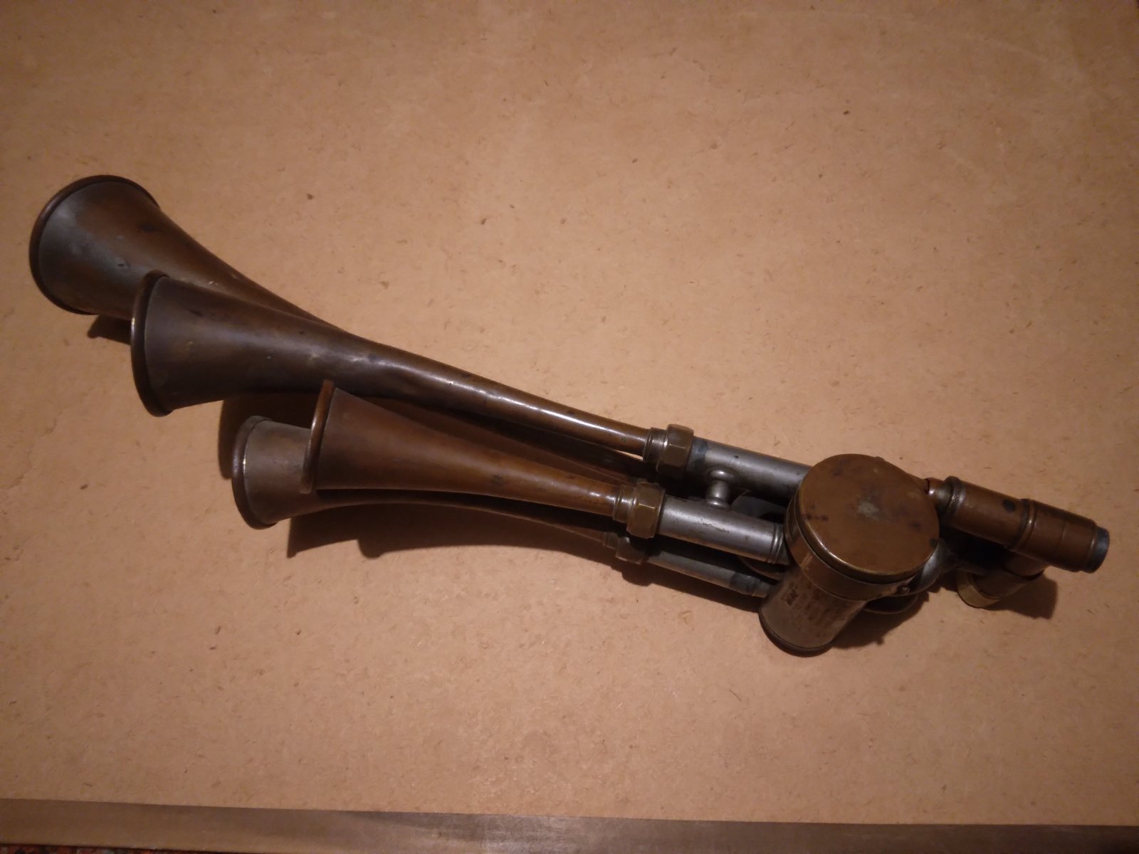 I have a Le-Testophone musical horn for sale. It is a Bulb type and has 4 separate length horns. I have not seen any of these in a long time on the old cars. They were a very popular accessory with the brass era guys for a long time. This horn is in pretty nice condition. I tried it when I first got it with a bulb I had then. The slide valve worked, and I got all four horns to sound off. Each squeeze of the bulb sounds a horn and then rotates the valve to the next horn, and so on till all 4 horns have been sounded and then starts over with the first horn again. This horn will need to have the slide valve at least cleaned and oiled. The dust cap on the end of the slide valve is missing but it is just a simple metal cap that should be easy to find or make. The mounting bracket works as-is but could be made to look a little nicer with a little cleanup and make the brazing look a little better. There are a few small dings in the horns but nothing major. All the brass is solid and does not have any stress cracks. Overall, it is a nice restorable horn that very few people have. Im cleaning out the shop of projects I no longer need, So it's time for another person to be the new caretaker.