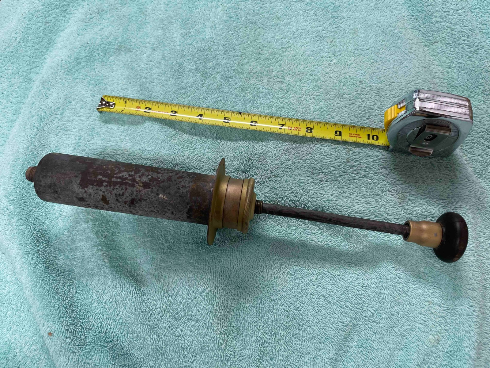 Original teens or twenties hand air pump to pressurize a gas tank or use as a transfer pump, mounts on an instrument panel, not dented and in good shape, will need new leather or neoprene plunger seal, brass construction.