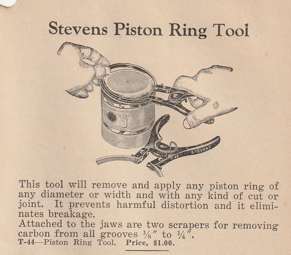 I have a Stevens piston ring expander tool for sale. It is in nice shape but does have one of the little finger/guides broken on one end. It probably is still functional as is, but I have not tried it. It is a hard-to-find tool and has been on display in my collection for years.