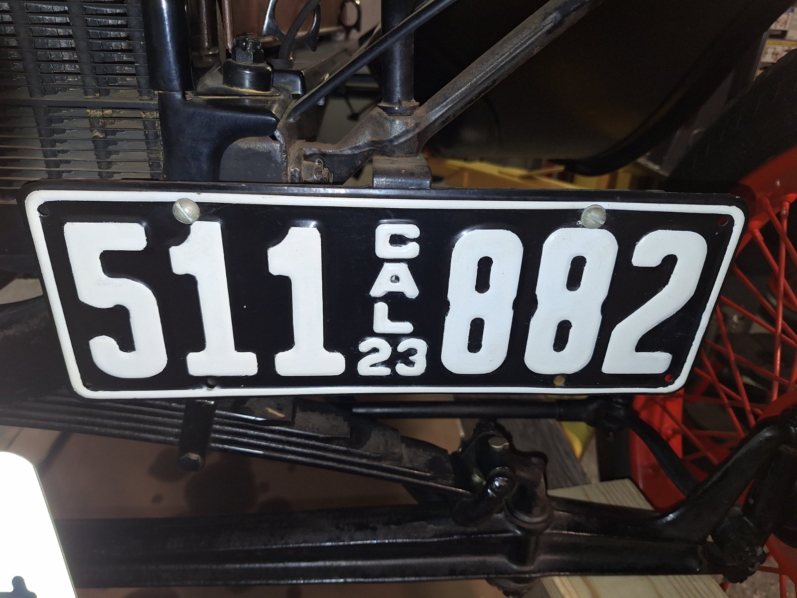 The bracket pictured clamped to the fork is on my 1912 touring it was on the car in 1960 a complete running car my thought is it is from 1915 or later because the early Manitoba plates are short that is why there is an extra hole so I can put the 12 plates on the car . It is an original Winnipeg Manitoba Canada car built in Walkerville Ontario.