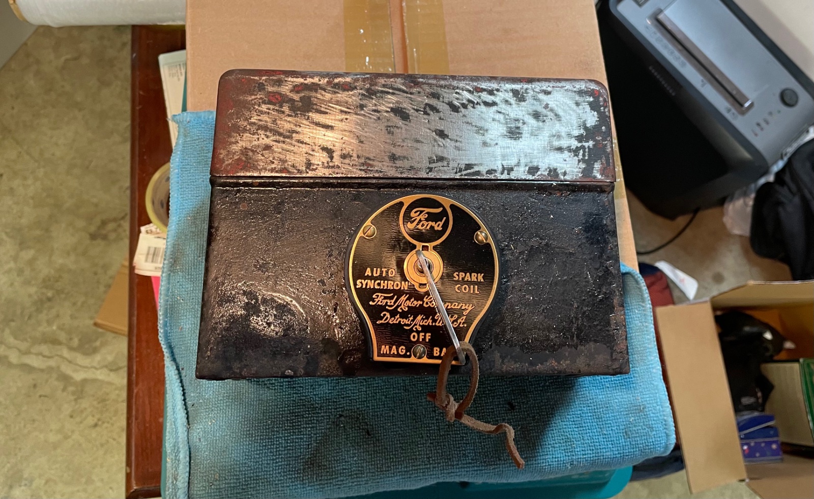 1915 coil box, new switch the box is solid the round corner lid is in good shape as well, one exception the inner brace is loose on the lid but it is with it…. Looking for $370 for the box lid and new switch with key… Plus shipping.