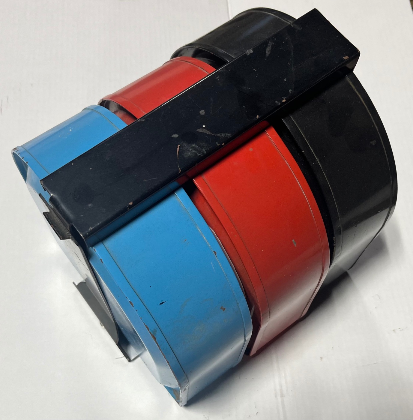 Reproduction Set of 3 containers with Running Board Holder that allows transportation of Gas, Oil, and Water. Mounts on the running board. Made so a padlock and secure the 3 cans in the holder. Never used but could use new paint. White plastic dividers can be seen in the photos. $375.00 plus shipping Lang’s 1-800-872-7871
