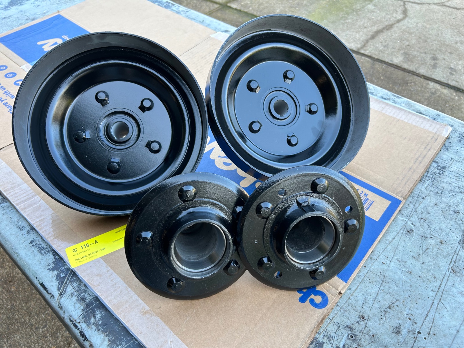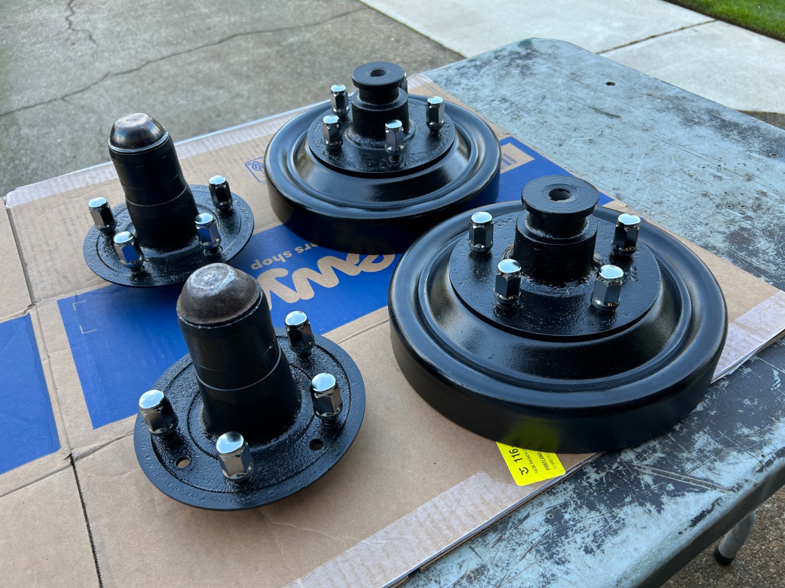 5 powder coated wire wheels with hubs.