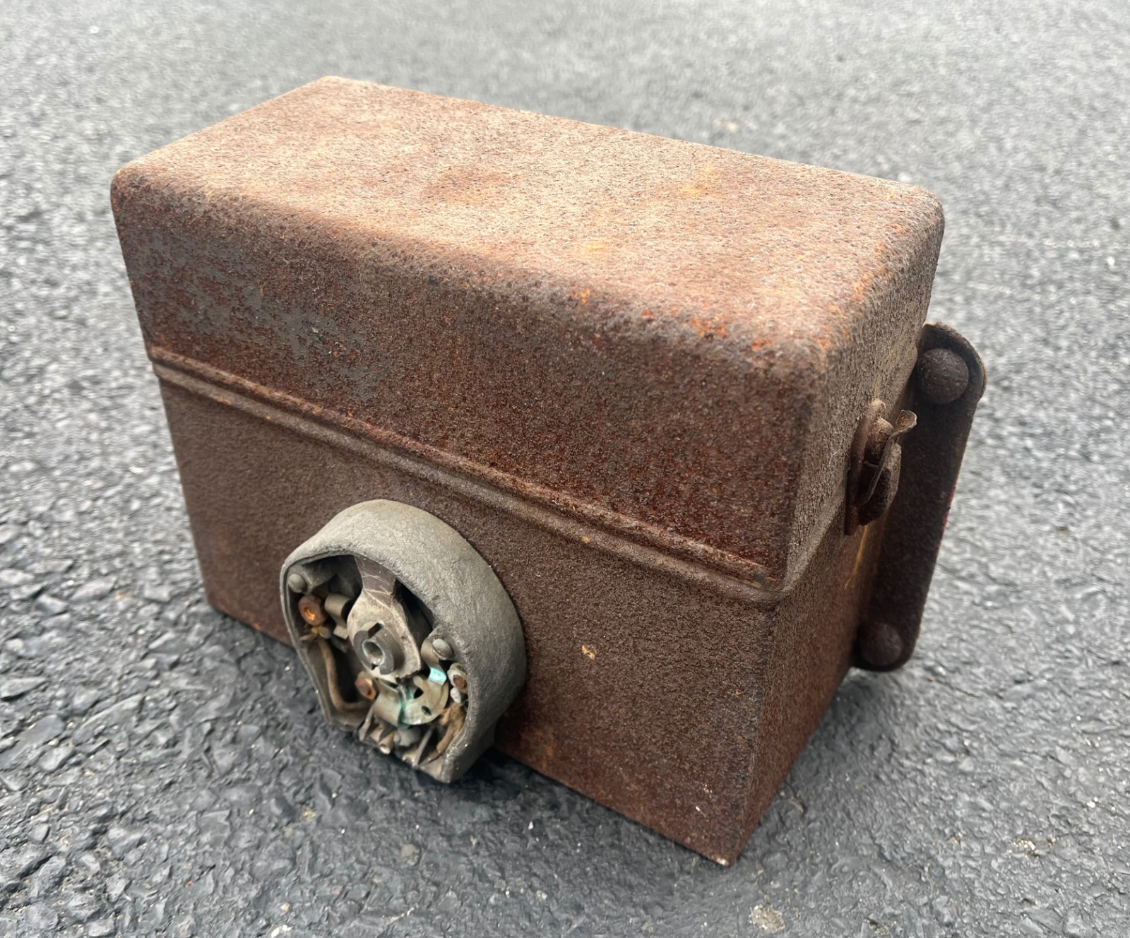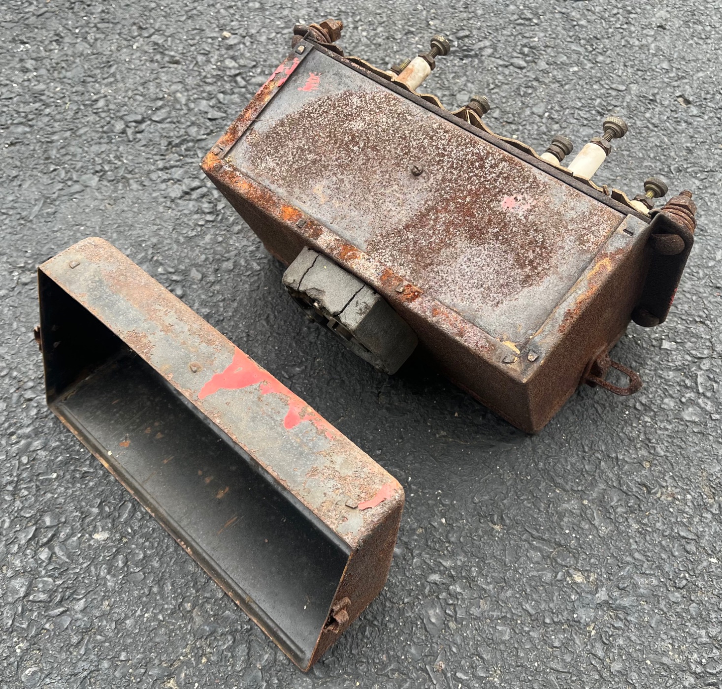No dents that I can see, it does have some rust pitting. Switch is in very poor shape. Looks like someone has replaced the wood in the past but it obviously needs to be replaced again. All the contacts and porcelain look to be in good shape. A couple thumb screws are missing.