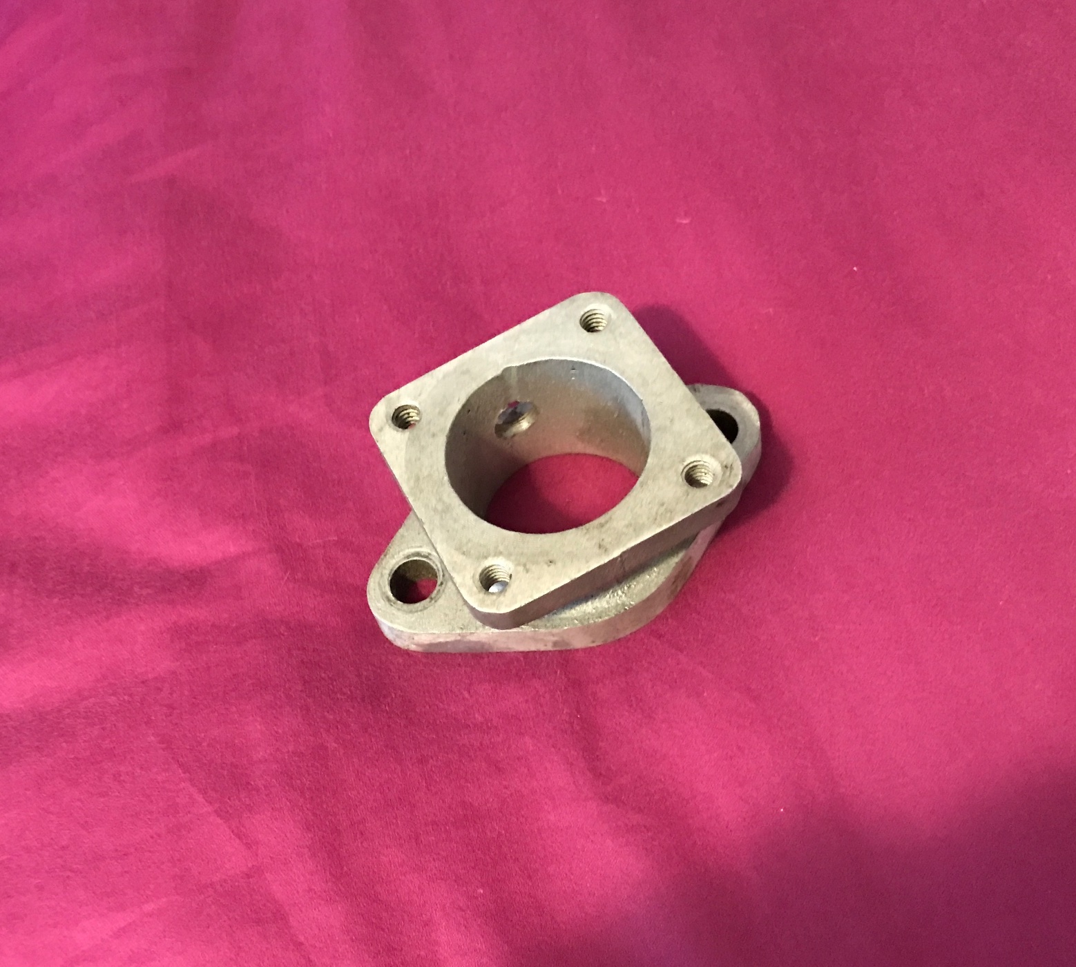 Original Winfield carburetor adaptor. Cast aluminum, with S-63 numbers cast into it. Has a threaded hole for fuel primer or brass plug. Measures 1-5/8 between center of holes on square mounting side. 2-11/16 between center of holes on manifold mounting side. 1-7/16 x 1-1/2 diameter taper in bore. 1-1/2 opening on square side. 75.00 includes shipping.