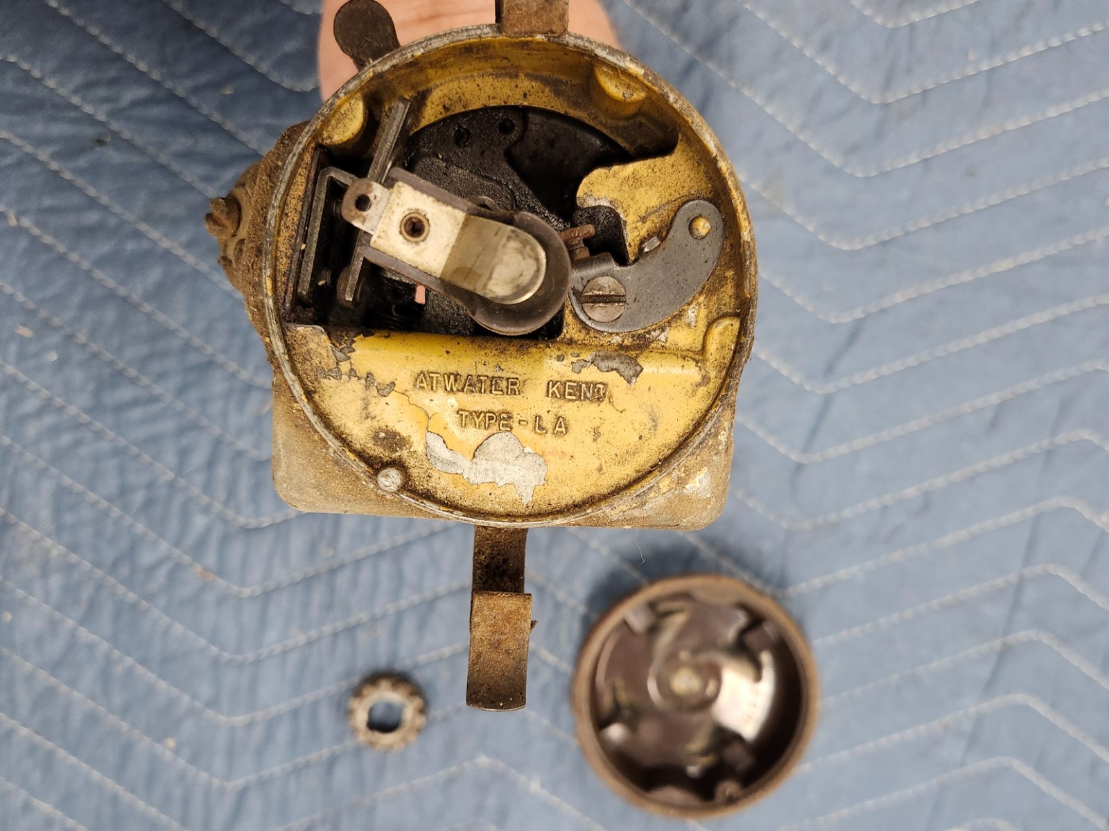 I have this Atwater-Kent model LA distributor that I have made no attempt to clean or restore. It is in very good unrestored condition. It has the driven gear but is missing the the spacer for behind the gear (on the camshaft) and the dust cover plug which is on the bottom of the distributor body.
