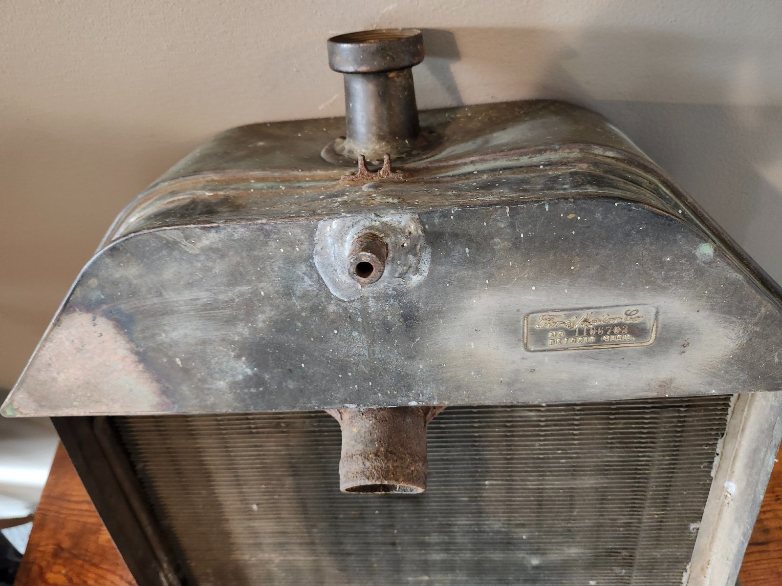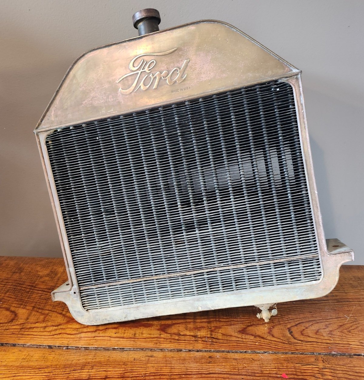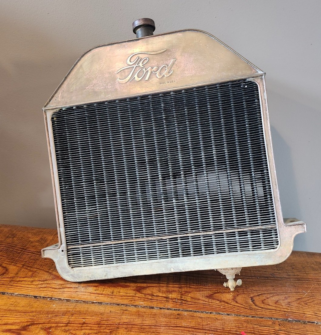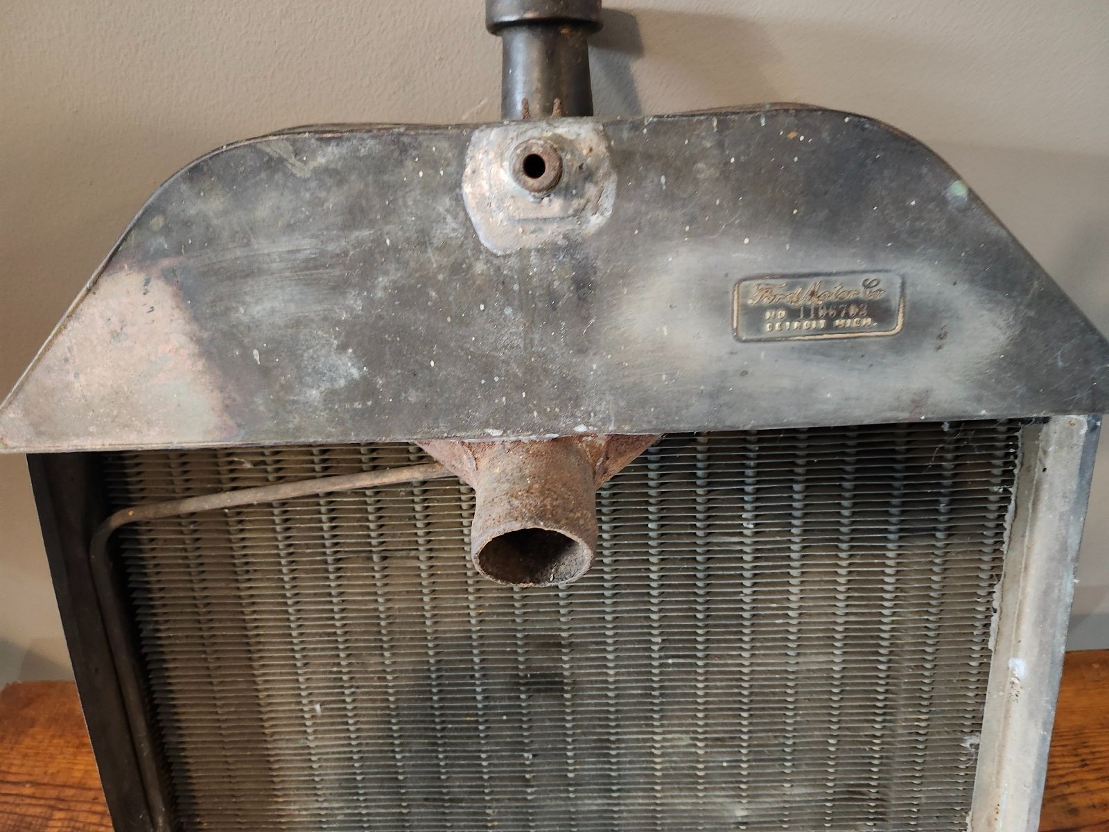 This is a really nice original radiator. Barn find. Actually from a garage full of neat stuff. It has the wire tube on the rear of the core. The stamp on the rear is #1106703. The tank below the neck area is slightly pushed in but it could be easily pushed out. The fins are good throughout. The neck is good. Both the water inlet and outlet are good. The mounting ears are good. The Ford script and the Made in USA is crisp. Haven't seen a good one like this for a long time. Perfect for a good original car. Take a look at the photos. Let me know if you need more photos. Price is 700.00. Rather not ship it, but we can talk. Call me at 734-730-4274 or email directly at motoringicons@hotmail.com I do not answer messages posted here. Thank you and Happy Motoring!