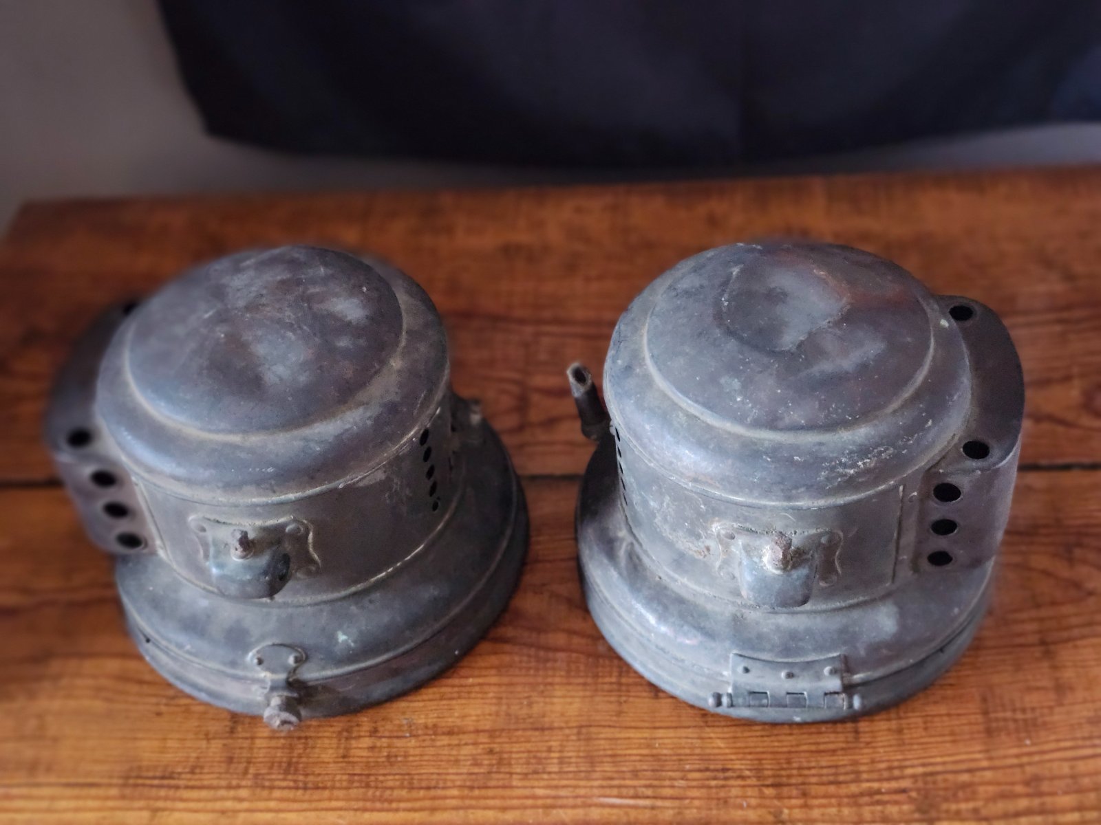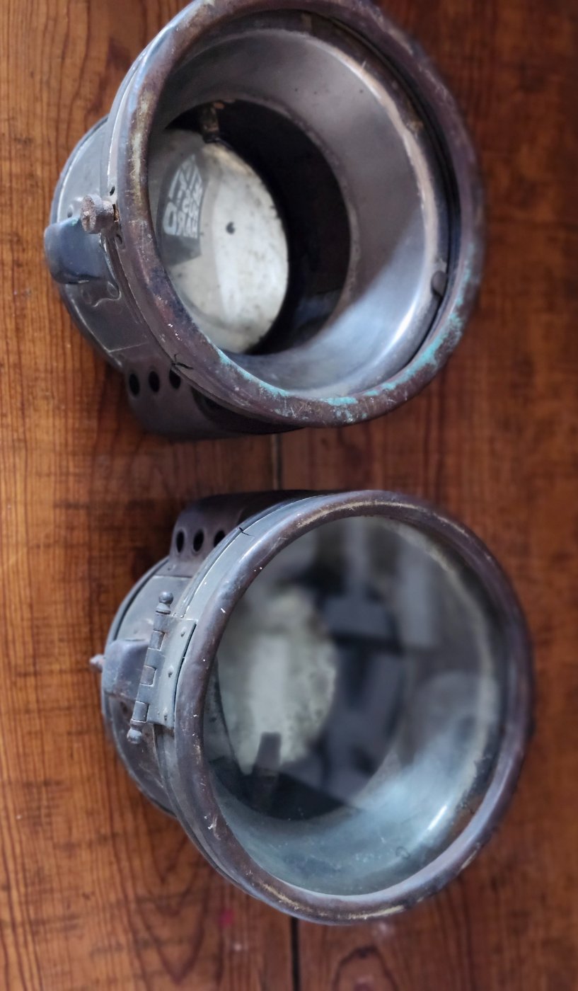 A nice, unrestored pair of headlamps that would date to about 1908-1912. The approximate measurements are 9 1/4" in diameter and height and 8" in depth and 7 1/2 inches between the fork mounting holes. There is no name on these so they can be used on any car. One has a broken reflector and the other one is missing a plain lens. There are a couple of small splits on the rims and there are a couple of small dents. Both have the outer reflectors, thumbnuts, burners, etc. A good pair for an unrestored car or can be easily restored. A good pair of brass headlamps. Price is 450.00 including shipping and insurance via FedEx Ground within the USA. I don't answer messages here but you can call me at 734-730-4274 or email directly at: motoringicons@hotmail.com Thanks and Happy Motoring!