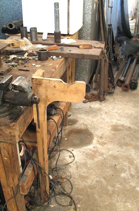 Scott, I think your answer starts by knowing if this is for a one-time project -or a tool that will be used multiple times. If multiple times, -and if you are handy with wood, a 4'x4' sheet of ¾" Plywood from your local big box store is your friend. Rip into 3 equal widths (approx 16" ea) and glue together to make a true 2" thick board. Duplicate the shape of the one in your pictures and paint it to preserve. You will have a tool that you can bolt to your workbench that will be robust enough and last forever.