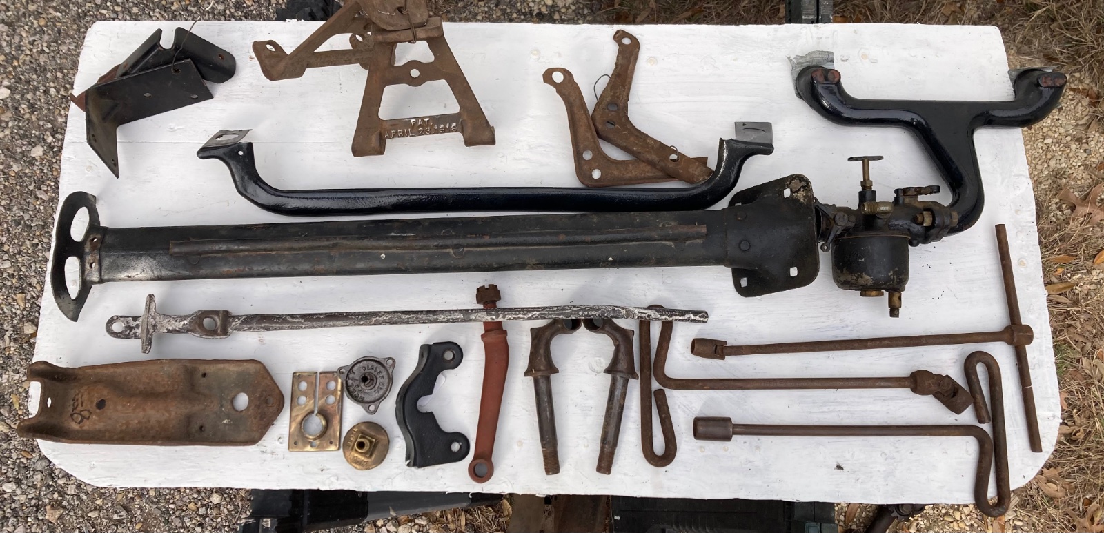 Beginning Top Left: TT C Cab front and rear corner brackets (2) + 1 curtain frame bracket.$25 Accy cast or forged crankcase ‘ears’ Pat’d April 1918 Zoom In! $40, Pair pan/hogshead/block brackets.$35 Really nice NH Straight Thru Carb and manifold. Removed it and replaced with a U&J Only $350, Powder coated ‘17-‘23 sheet metal radiator lower apron $35, Really nice original ‘26-‘27 steering column cab sheet metal.$25 Pair of early front fender/headlamp brackets for use w/ acetylene lamps (only 1 displayed).$75 Really nice Ford crankcase ‘ear’ $10, brass top coil piece $9, brass sediment bulb connection $5, Holley 3 screw carb top (iron) $9 (zoom in), Early spindle arm $20, pair real nice spring perches.$65 3 early automotive socket tools $30..All + cheapest shipping