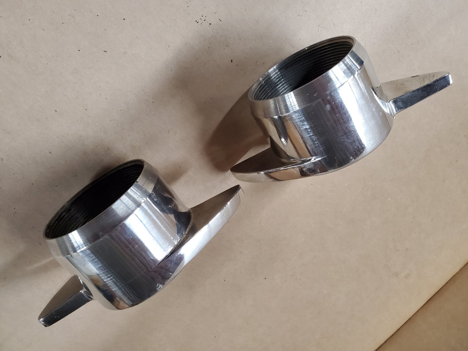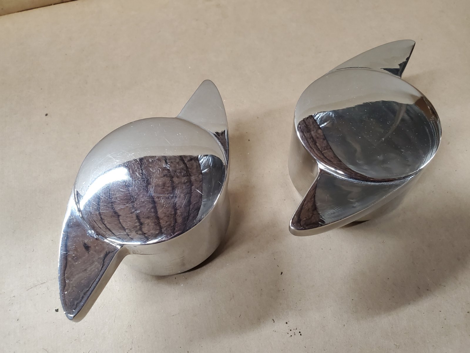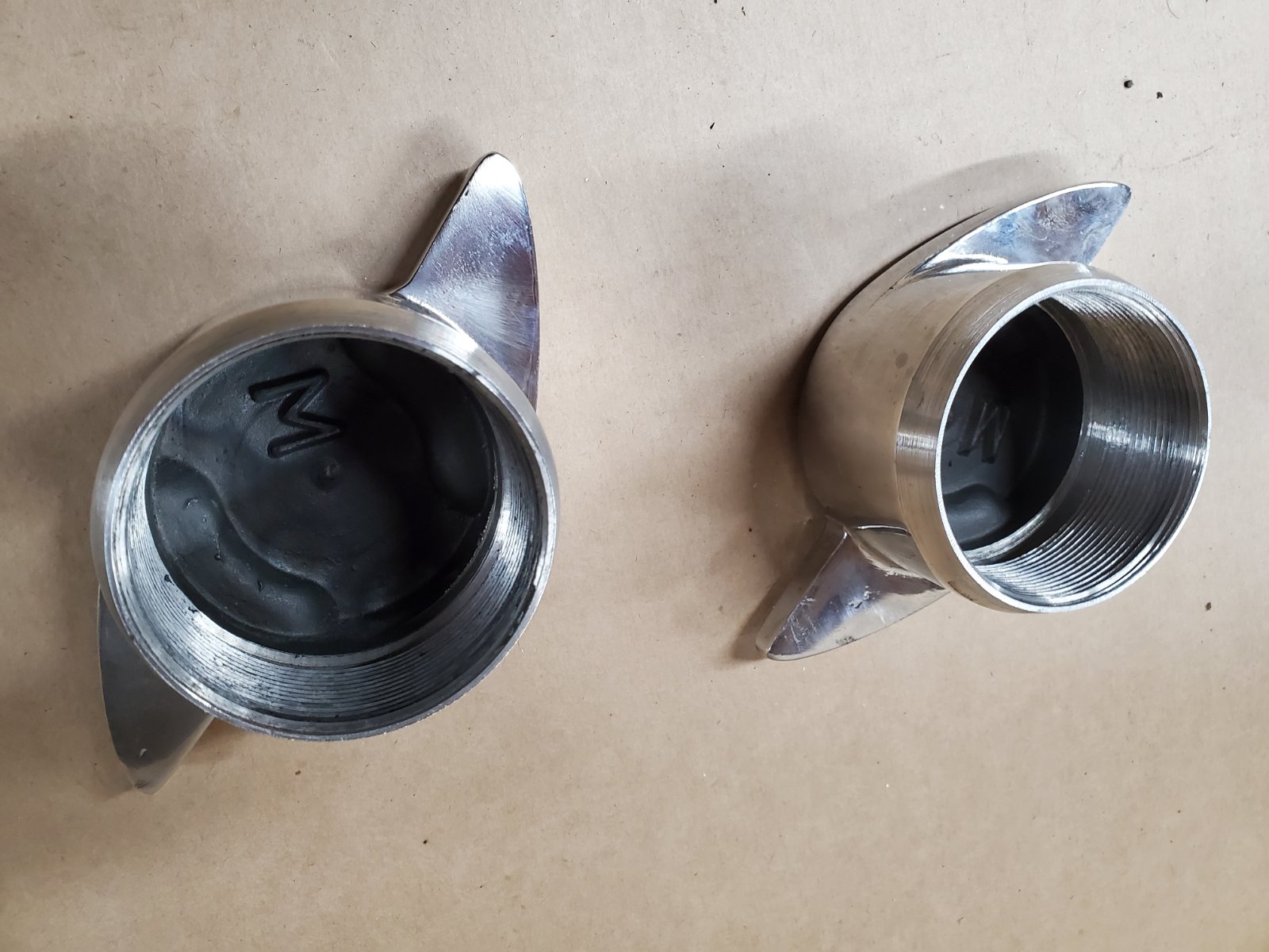 2-ear knockoffs like this? Someone made these some years ago. Fit Buffalo and House #3, Model T size. Just 2 pieces, one right, one left. Chrome plated. Threads are sharp and snug, not wallowed out like many originals. Appear to have been used, but barely. There were more made, so maybe someone else will have another pair available. / Tim