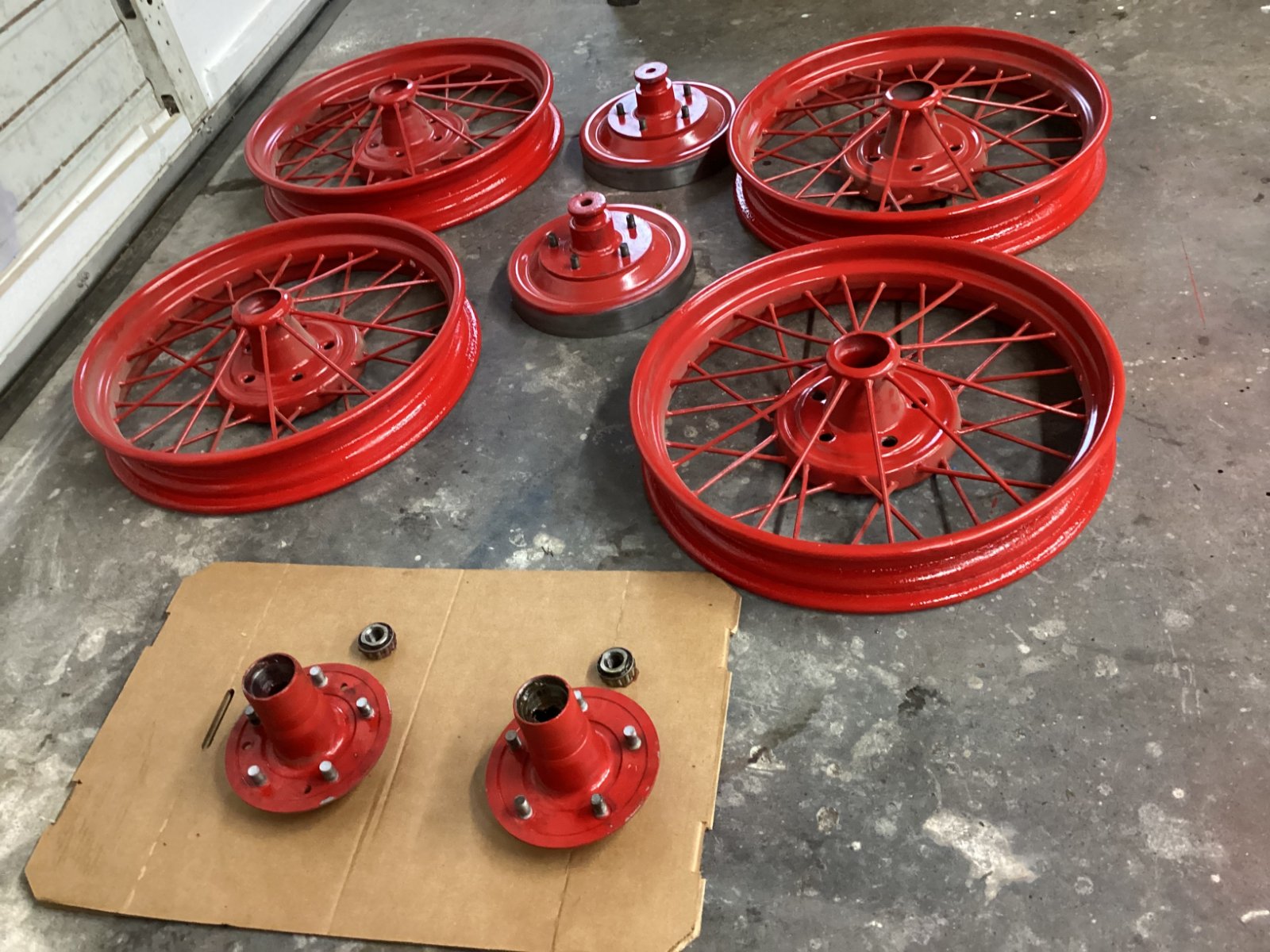 For Sale, Four wire wheels with hubs, front hubs have NEW inner/outer race (installed), NEW inner and threaded outer bearings, NEW seals, NEW cad lug nuts and 4 brand NEW universal black-wall tires with tubes. Tires and tubes still in wrapper-- Bearings have been greased but never run--