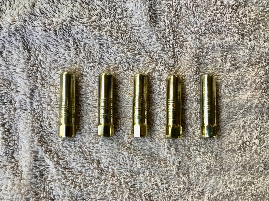 Set of 5 original era polished brass valve stem covers. These are good heavy ones that don’t twist or bend. Nice polish, some minor nicks here and there but no dents. Very nice and ready to use. 75.00 includes shipping.