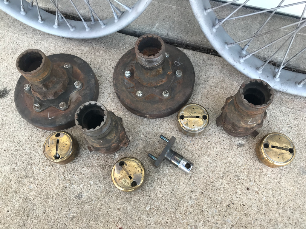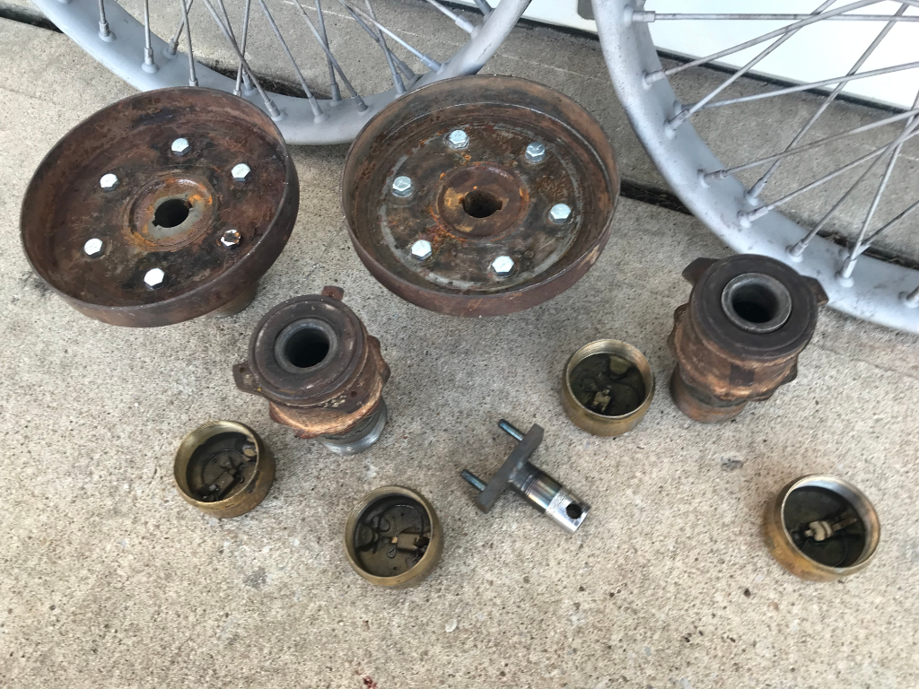 With Tulare and Luray coming up, I thought there might be some pickup options. I have decided to part with this set of four wheels (30x3.5) and four hubs (2R, 2L) with caps in Model T size. Some might run them, but were it me I would re-rim all four. Two rims have pretty deep pits on the inside and marginally sharp spots. One rear hub has a small crack that could be repaired. I'm happy to answer any questions I can and provide additional pictures. These are early House wheels, hubs, and caps but are made by Wire Wheel Corporation and interchangeable with later Buffalos, to include current reproduction parts and services. Pick up in Kansas City metro area. $2500 obo.