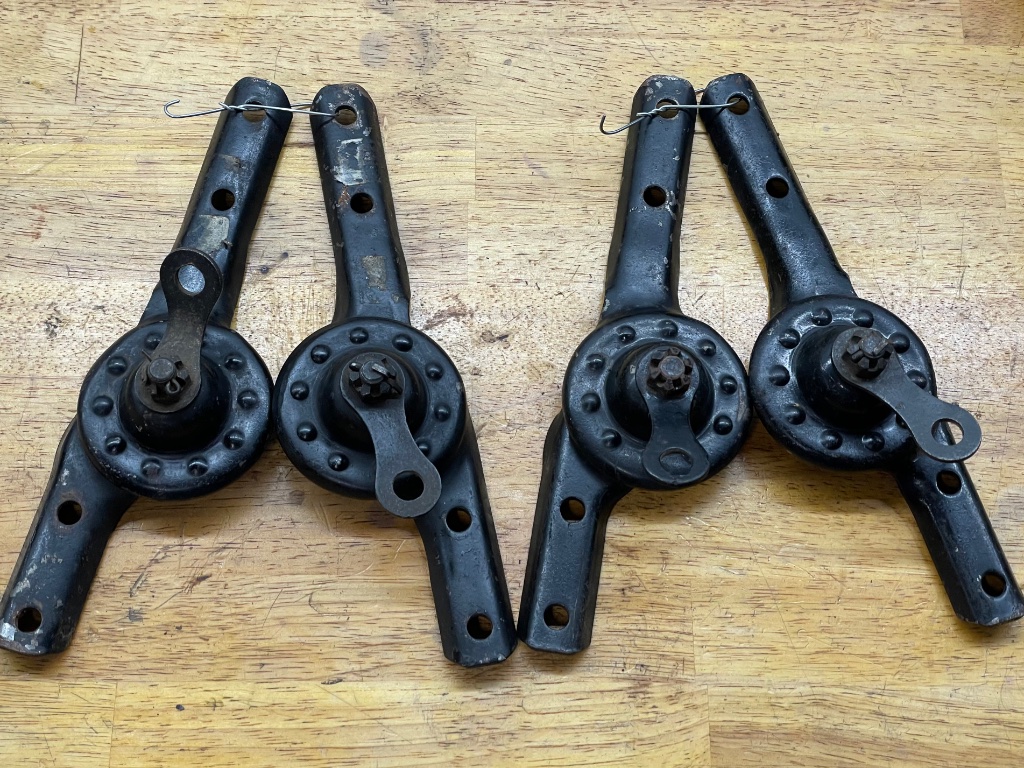 Two pairs of the later style offset open car windshield hinges. One hinge in each pair is NOS. The other is a very nice original. All of these hinges have the original Ford paint and are in excellent condition.