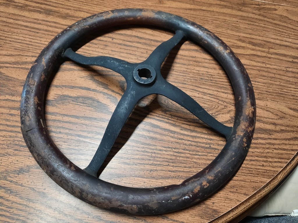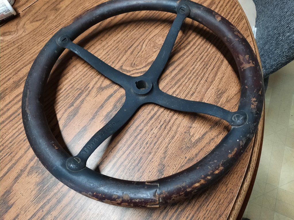 For sale: One piece steering wheel. Ford script and #T902 BO. needs refinshed and the joint needs reglued. $75 plus postage