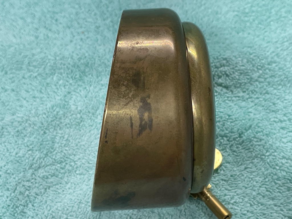 All brass angle mounted dash clock, winds and runs ( key included), needs a mounting bracket made ( simple to make and concealed when mounted), 4" in outside diameter, no dents cracks or repairs, SOLD