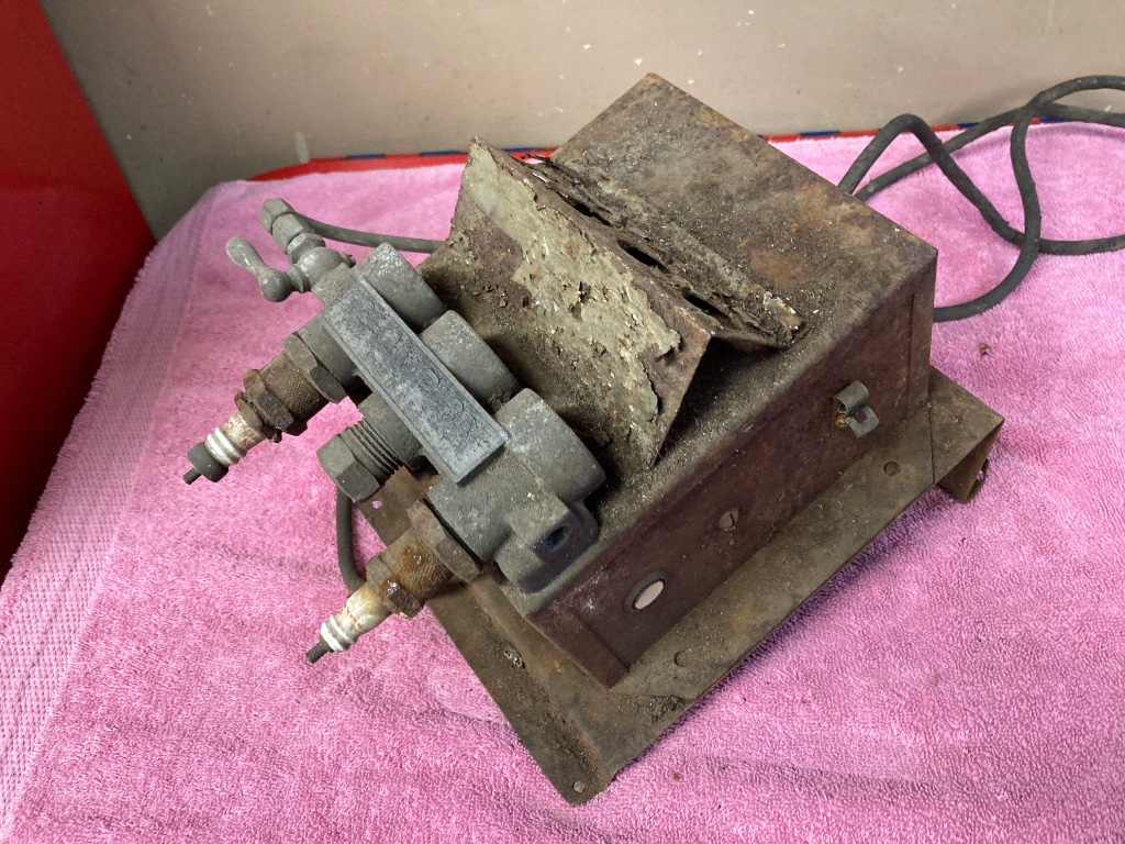 Here is a neat old piece. This is a Champion Spark Plug Tester from 1936. It uses a model T coil inside. It is missing the gauge that would show how much pressure was in the chamber. The pressure was used to simulate the combustion chamber pressure so you could see how the spark plug performed under pressure. There were adapters so you could check different types of plugs. The only adapters with this one are on the plugs. I have not tested or opened it up but it sure would be neat restored or to be made functional again. See the link below for more information.