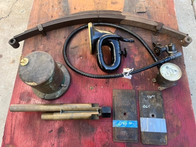 Tapered leaf front spring, $200.00. E and J brass generator top tank, $225.00. 1915 horn, $100.00. Jones speedometer, cable and drive. 2. 50 to 1 ratio, right hand drive. $800.00. Exhaust whistle, $75.00. Valve cover doors, .065 thick, $40.00 pair, .040 thick, $10.00 pair. All plus shipping. Kdmks AT att.net.