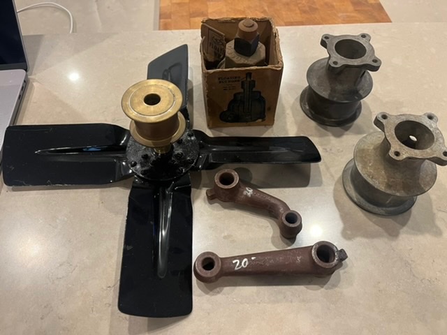 Nice brass hub fan, $85.00. NOS aluminum fan hubs, $35.00 each. NOS fan arms,$20.00 each. NOS rear hub puller $65.00. All plus shipping. kdmks AT att.net.