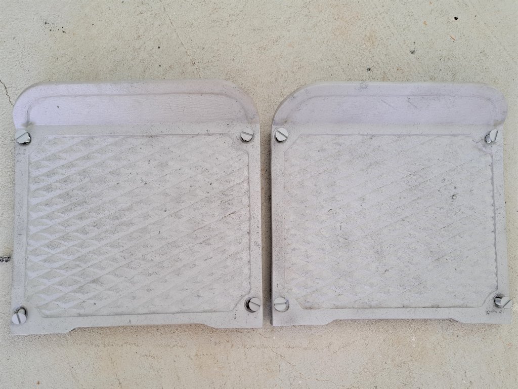 Unusual aluminum step plate set with mounting hardware. Will require polishing. Price is $40.00 for the pair plus $17.10 domestic flat rate shipping. Mark Chaffin (951) 805-0928.