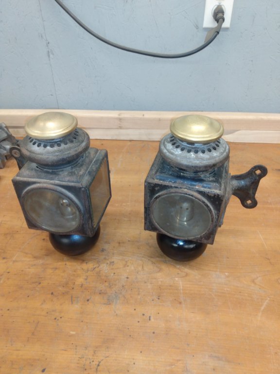 A rather nice set of lights. Excellent chimneys, fonts has one small dent bottom of one. All glass is good. Burners and wheels intact. 340.00 for the pair plus shipping.