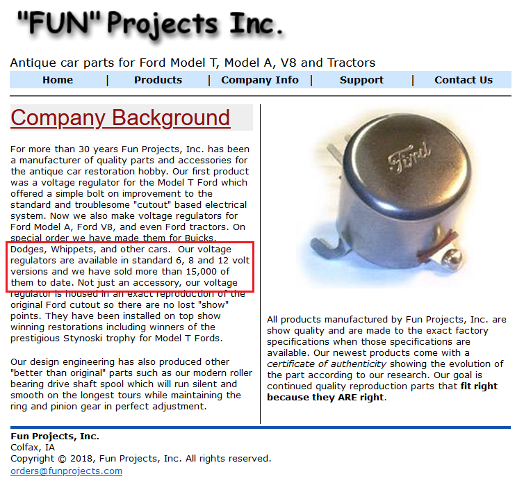 The voltage regulator made by John Reagan was sold only in a 6-volt version….and either a negative ground or a positive ground….the model t was a negative ground……the model a was a positive ground……..unfortunately there wasn’t enough demand to keep manufacturing them.