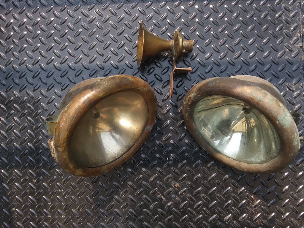 SOLD: Neat Pair of Accessory All Brass Electric Headlamps and Horn for Model Ts and Others