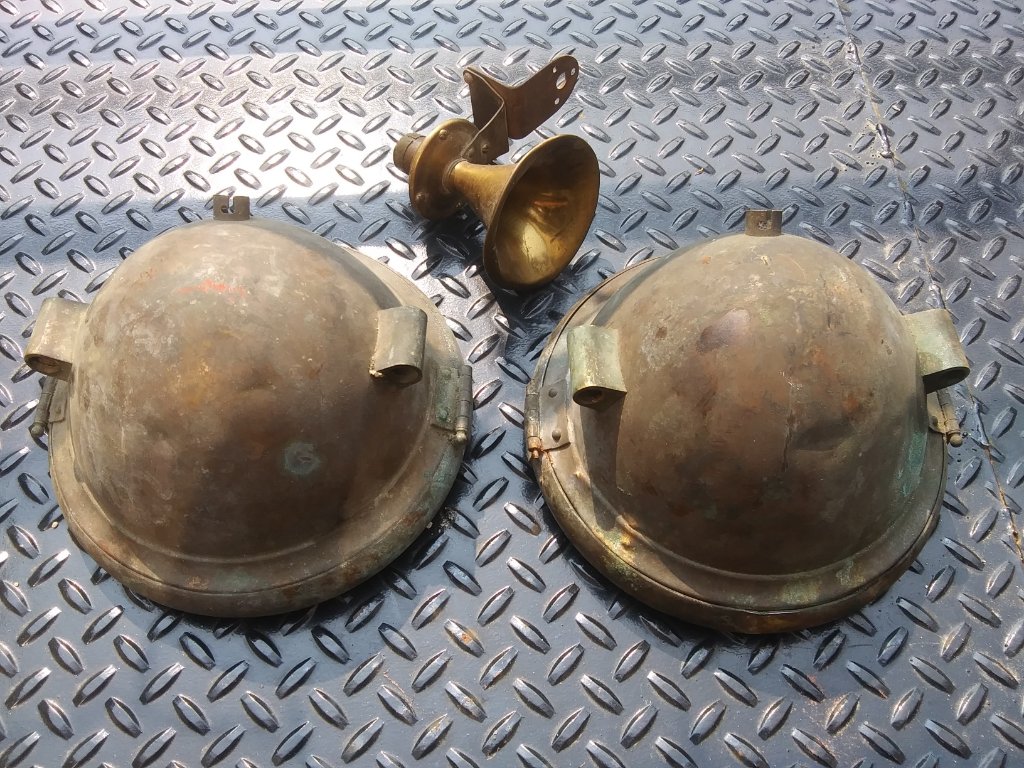 Here is a neat pair of accessory, all brass electric headlamps and a matching electric horn. These would be accessories for 1914 and earlier models that were originally had gas lamps.The lights are 9" in overall diameter and 6 1/2" in depth. The fork mounting is 6 3/4" hole to hole which can be used with 1914 and earlier forks. These would fit 1914 and earlier Model Ts and other brands with forks. These brass two headlamps and the brass horn are solid and in good, unrestored condition. The headlamps have shiny, original, reflectors, good lenses and sockets. Take a look at the photos, you get what you see.