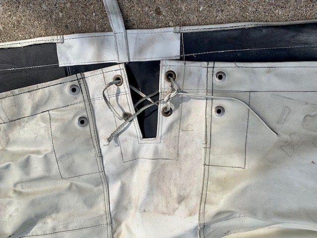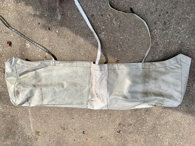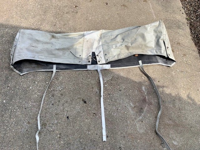 This is an older top boot, in white, made custom for a 1926-1927 (may fit others) Model T Ford Touring Car convertible top. Has all three straps to affix to the back seat and a tie to cinch up the boot tightly as well. Could use a very good cleaning because some mice took up residence over winter. No chew marks but does need deodorizing when you stick your nose in close. Very thick and solid vinyl fabric with black cloth liner.