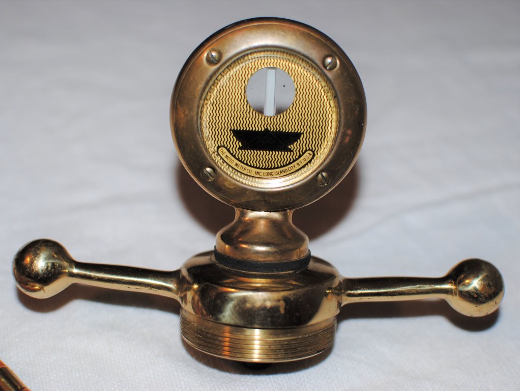 C: Combination brass dog bone radiator cap with winged Ford logo Moto Meter and working thermometer.