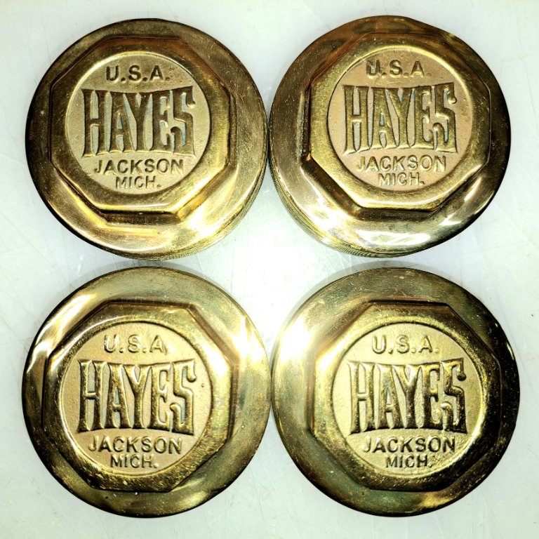 I have one set of Hayes hubcaps for wire wheels. These were made several decades ago and are made of yellow brass. These are in outstanding unused condition. Rare as hen's teeth these days. Price is $800 with free domestic shipping included. Mark Chaffin (951) 805-0928