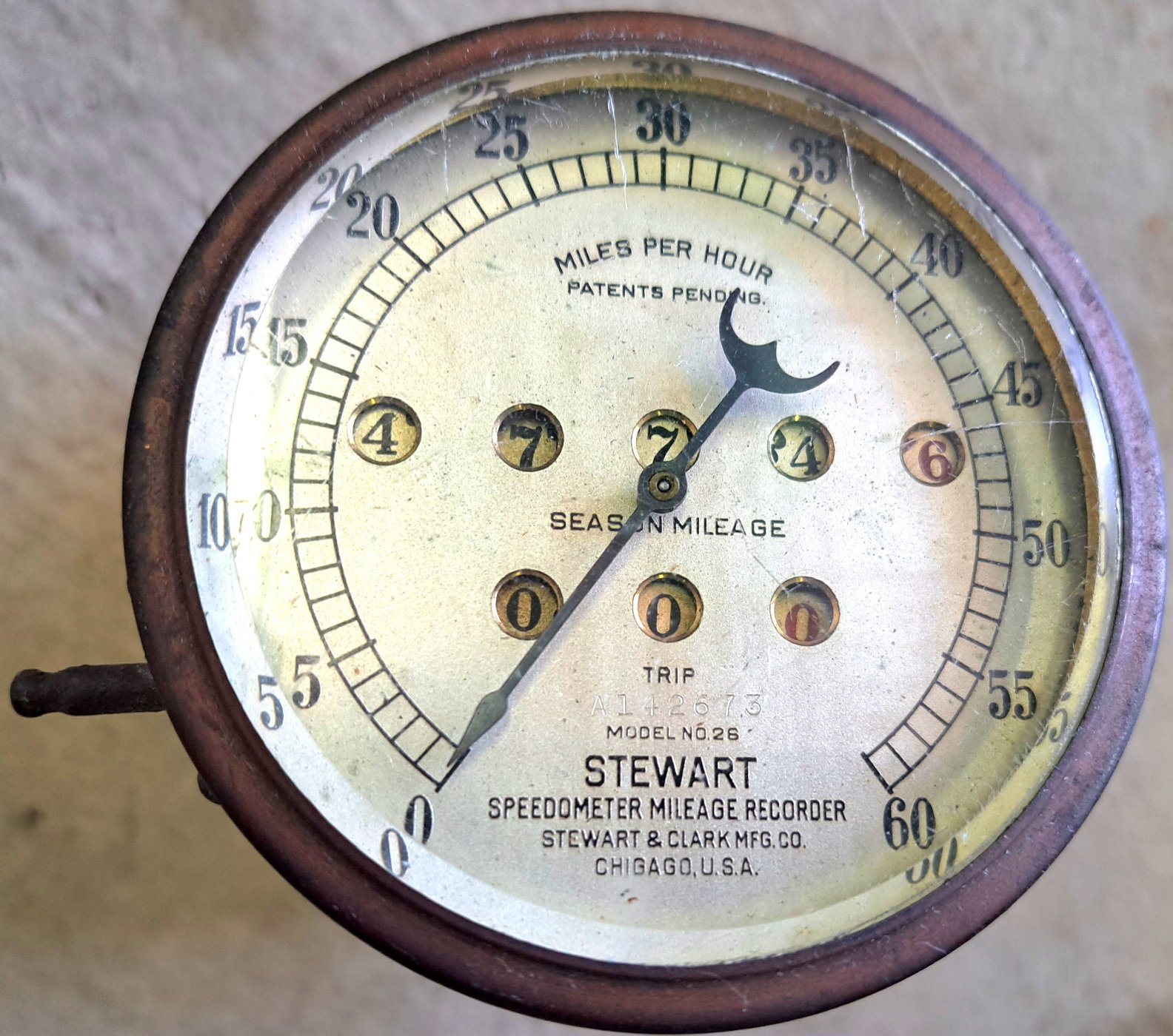 Early Stewart Model 26 speedometer with mounting bracket. Swivel and needle turns freely. Price WAS $325 NOW $250 with domestic shipping included. Mark Chaffin (951) 805-0928